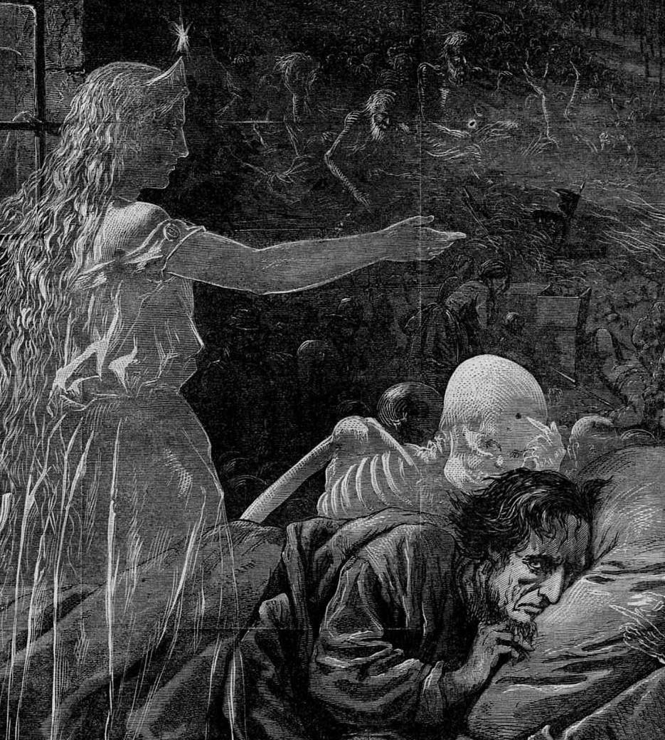 Le jour baissait, comme je l’ai dit, mais la nuit n’était pas encore venue. La route formait comme un long sillon clair dans la campagne. Quelques bouquets de sapins çà et là, des genêts, aucune autre trace de végétation. Le froid ne tarda pas à nous saisir ; le vent sifflait avec fureur, et l’on entendait seulement le trot cadencé des chevaux et le tintement strident et clair de leurs grelots. Aucun de nous ne parlait. J’avais les bras accoudés sur le dossier de la banquette, ma tête appuyée contre les épaules de mon ami afin de me garantir du vent. Je pensais alors, à quoi ? à Paris, à notre jeunesse ; j’étais emporté par la Folle du logis, et bien loin de X… lorsque, tout à coup, je sentis l’étreinte d’une main qui se crispait sur mon épaule. Je tournai brusquement la tête. Une horrible apparition se présenta à mes yeux : à la place vide à mes côtés, une femme hideuse, décharnée, aux yeux sans globe, était assise. Je voulus pousser un cri : le fantôme plaça son doigt sur sa bouche pour m’imposer le silence. Aucun son ne put sortir de ma gorge étranglée. La femme était vêtue d’une sorte de vêtement de laine blanche, la tête encapuchonnée ; la face était de la pâleur livide d’un cadavre ; ses yeux, deux trous noirs.