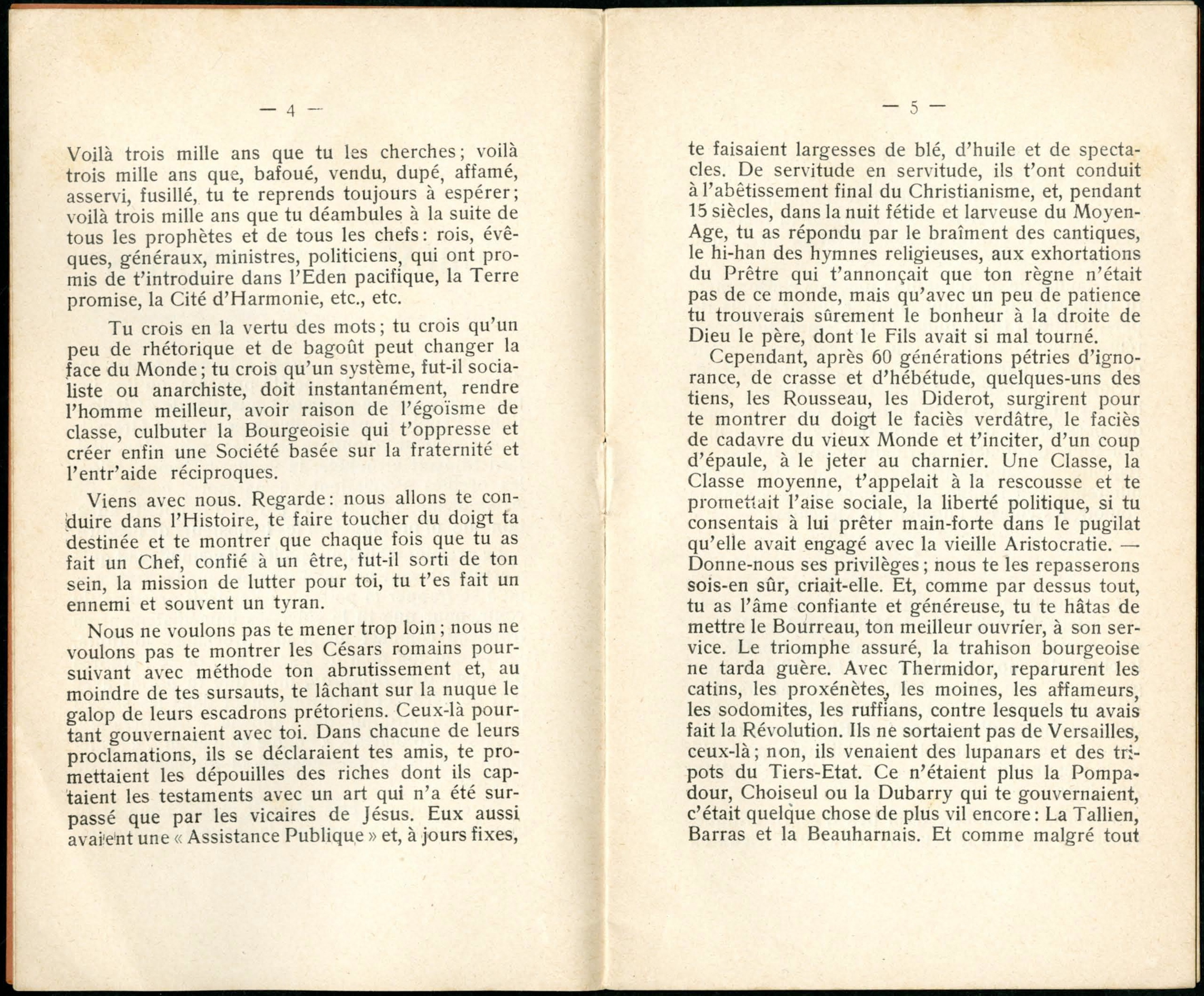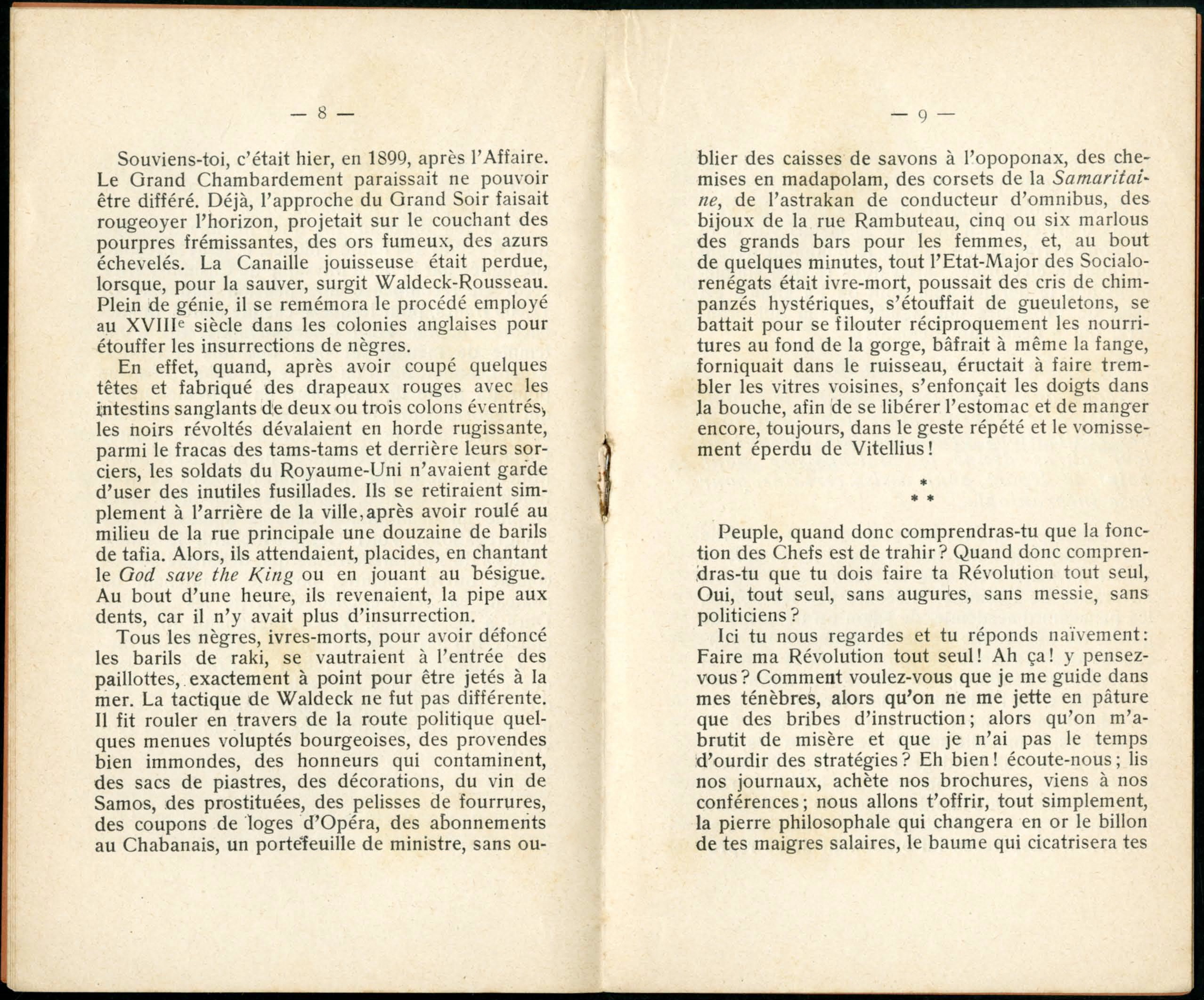 À ce moment reparurent les gros rats noirs du commencement. Leur coupole de cristal était immobile et haute. À l’intérieur, on distinguait une face d’homme, anxieuse et résolue. L’auto, avec un cri prolongé, se précipita vers ses assaillants. Les machines légères évitèrent son attaque et se mirent à évoluer dans tous les sens, sans cesse vers un autre endroit. Cependant chacune d’elles, à des intervalles, en s’approchant rapide et prudente, effleurait d’une fuite les roues du monstre. On voyait alors une pointe longue et mince, comme une flèche, surgir du flanc de ces étranges picadors et s’enfoncer dans les pneus. Certains, plus timides, lançaient leurs flèches de loin et pressaient leur course éperdue à l’autre bout de l’immense arène. Mais d’autres, prenant du champ, arrivaient droit, face à l’auto. Leur arme était non plus une flèche, mais une lance qui sortait de leur avant, longue de plusieurs mètres et très fine, comme une antenne d’insecte.