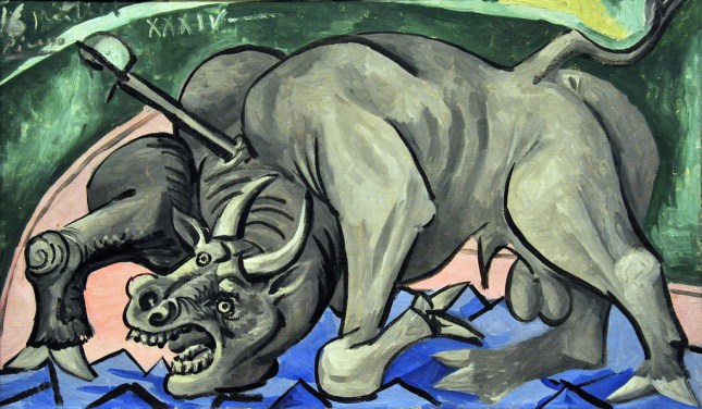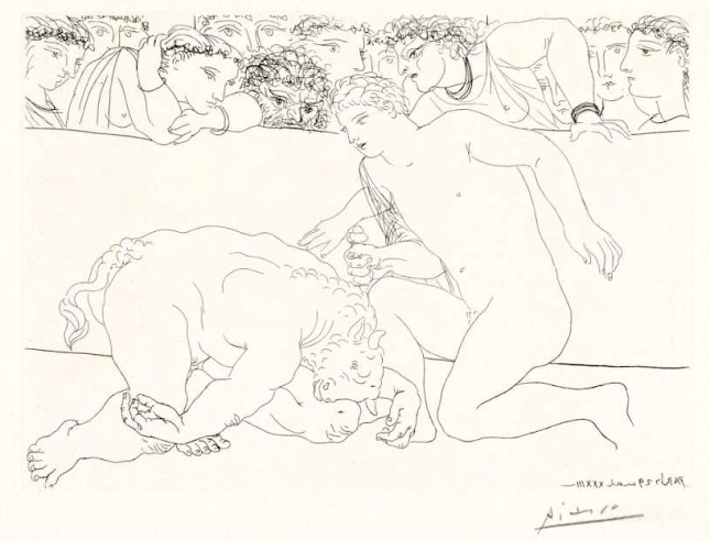 (Gabriel de Lautrec, in Le Supplément, grand journal littéraire illustré, vingt-cinquième année, n° 2875, mardi 7 janvier 1908 ; Pablo Picasso, « Taureau agonisant, » huile sur toile, 1934; « Minotaure blessé, » dessin, 1933)