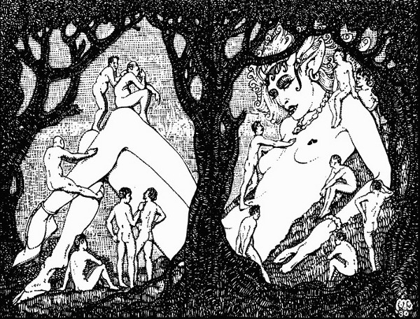 Il faut vous dire que la villa a ce faux air de château-fort qui fut à la mode vers 1880. Grâce à une gargouille de ciment, je grimpe jusqu’à une balustrade gothique, je l’enjambe et me trouve aussitôt dans l’ombre d’une sorte d’échauguette. Devant moi, une porte-fenêtre s’ouvre largement sur un salon décoré à l’orientale dans le goût du Second Empire. C’est un fouillis de tapis persans, de poufs capitonnés, de divans et de palmiers en pots. Les murs disparaissent sous les tentures de Karamani, les voiles de Gênes et les broderies arabes. Mais ce qui donne à la pièce un aspect quelque peu fantastique, c’est qu’elle est éclairée par des centaines de bougies multicolores : roses, bleu pâle, vert-Nil. Il y en a partout ; le lustre, les flambeaux de la cheminée, les appliques en sont garnis. Et, au milieu du salon, deux petites filles, vêtues d’oripeaux pailletés, dansent en se tenant par la main, semblables à deux fées minuscules. La personne qui tient le piano est cachée par une tenture de la fenêtre, mais par contre je vois toute une assemblée brillante et silencieuse qui contemple de ses yeux fixes les deux danseuses tourbillonnantes. Toutes ces petites personnes aux atours somptueux sont des poupées échappées à quelque conte d’Hoffmann ou d’Andersen. Elles sont assises les jambes raides sur les fauteuils, sur les divans, sur les tables, et la lumière tremblante des bougies miroite dans leurs belles chevelures noires ou blondes !! »