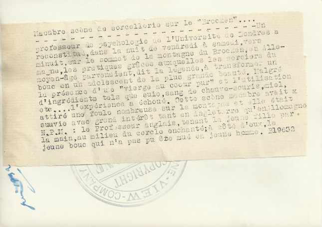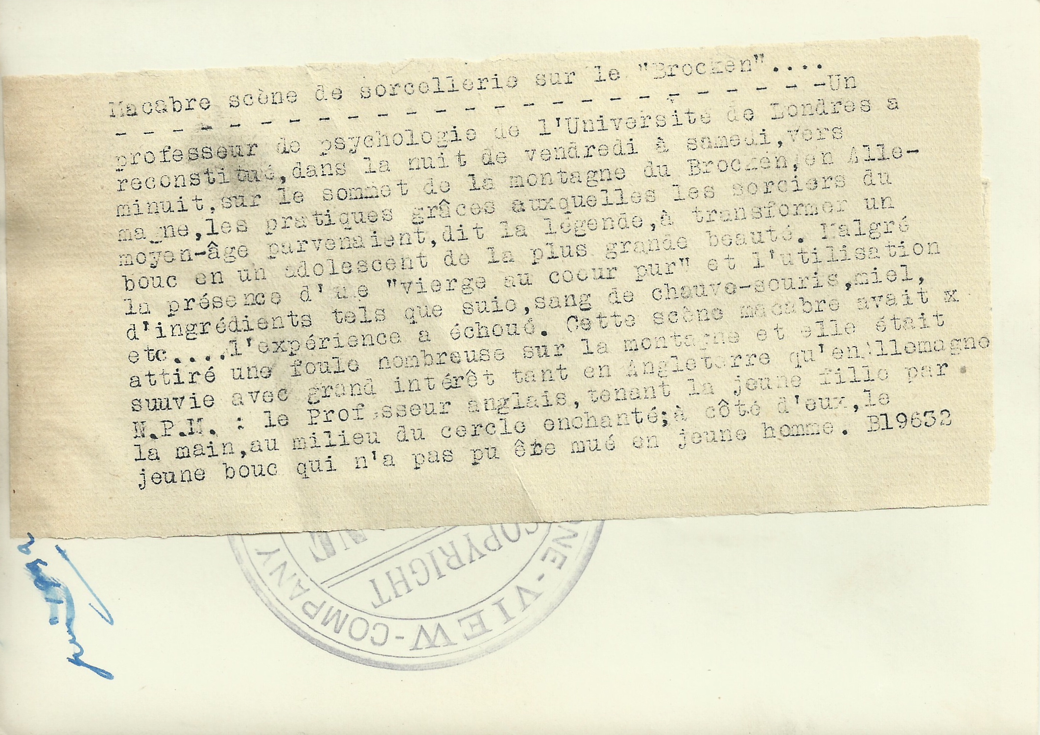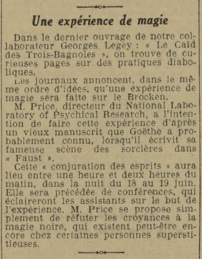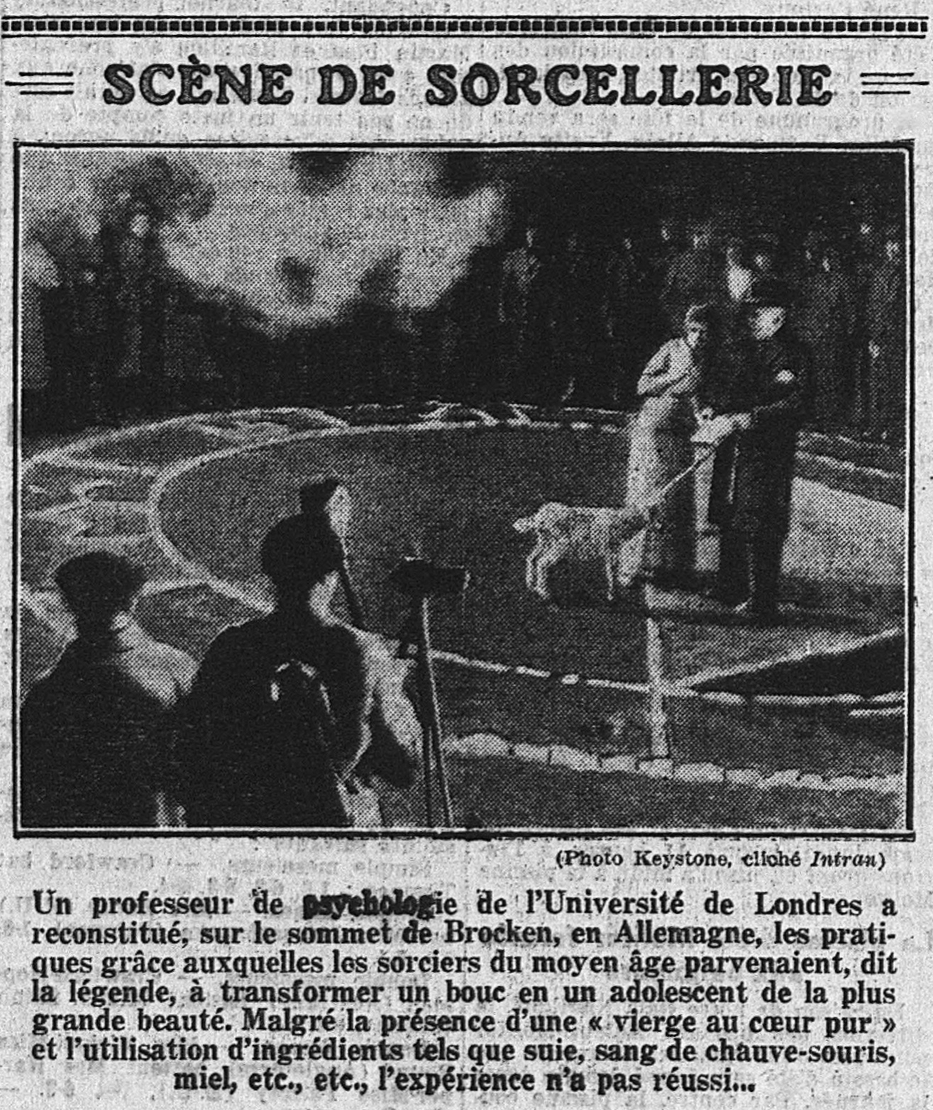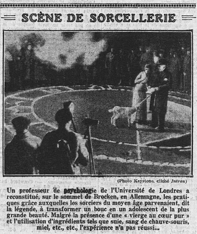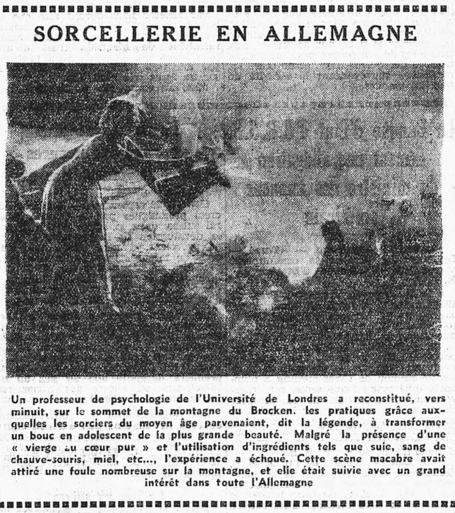 « Après le haschich, l’opium, la coco et les messes noires, les onguents des sorcières et le sabbat reviennent à la mode. C’est en Allemagne, sur le sommet du Brocken, que les chercheurs de paradis artificiels ont organisé, sous la direction d’un professeur de l’université de Londres, une manifestation sabbatique à laquelle assistaient plusieurs milliers de spectateurs.
