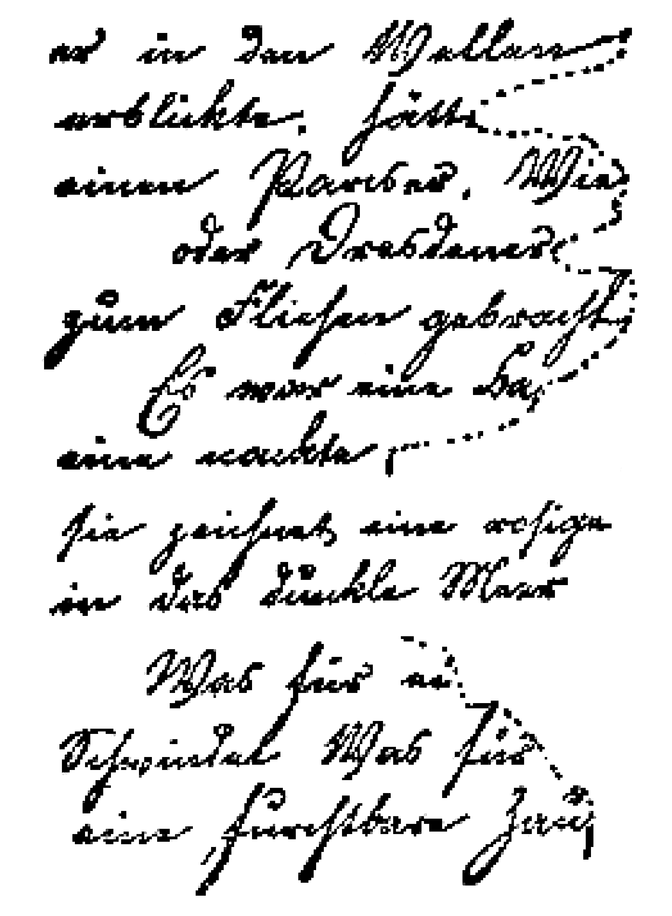 « Ce qu’il avait aperçu dans l’onde eut….. un Parisien, un Vien….. ou un habitant de Dresde fait fuir….. C’était une baig….. une nue….. traçant son….. rose dans la mer sombre….. Quel….. satanique, quel redoutable sortil….. »