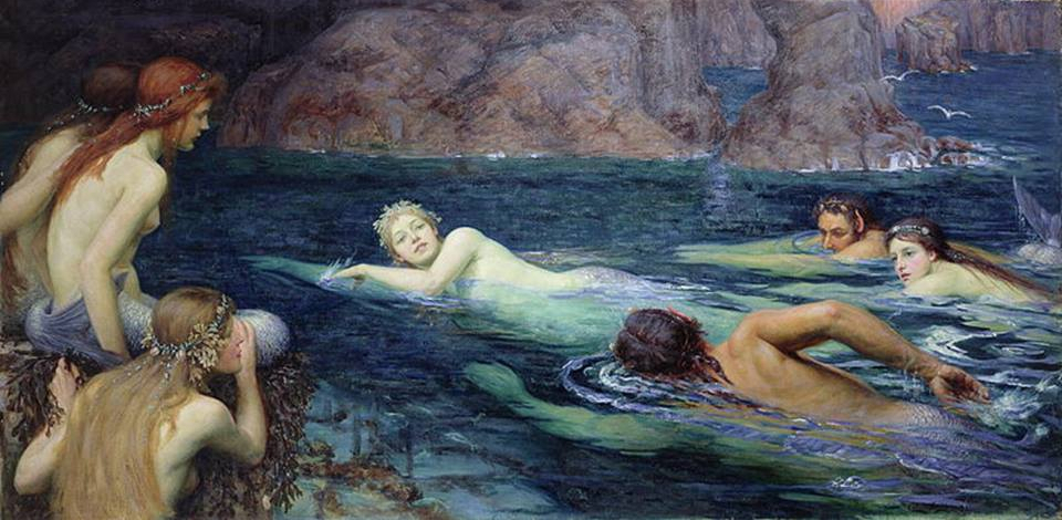 (Arnold Mortier, « Contes du dimanche, » in Le Figaro, vingt-neuvième année, troisième série, n° 308, dimanche 4 novembre 1883 ; Collier Twentyman Smithers, « A Race with Mermaids and Tritons, » huile sur toile, 1895 ; Louis-Maurice Boutet de Monvel, « Une Sirène, » aquarelle, 1895)