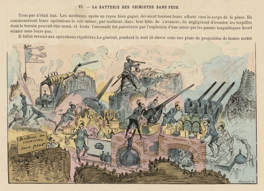 Enfin ! Nous voici au repos ; je veux dire en première ligne, face à l’ennemi, à quelque cent mètres seulement du G. L. G. (Grand Laboratoire Général). Les choses ont entièrement changé d’aspect, depuis quelques semaines. Et ce n’est pas sans une émotion profonde que je contemple le bâtiment massif, orné d’une coupole et agrémenté d’énormes cheminées où les chimistes-stratèges, penchés sur leurs cornues, actionnant leurs machines infernales, mélangeant leurs diaboliques ingrédients, s’emploient à diriger les opérations.