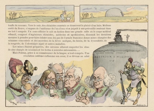 Le Gouvernement, dès les débuts, s’était réfugié en avant des lignes, dans la zone neutre qui séparait les combattants. L’État-Major général s’était situé à proximité du Gouvernement. Mais quand les microbes intervinrent, on décida de supprimer l’État-Major devenu inutile et l’on installa des laboratoires généraux. Le général en chef fut remplacé par le chimiste en chef, avec huit galons, assisté de nombreux chimistes et bactériologistes à six, cinq, quatre galons.
