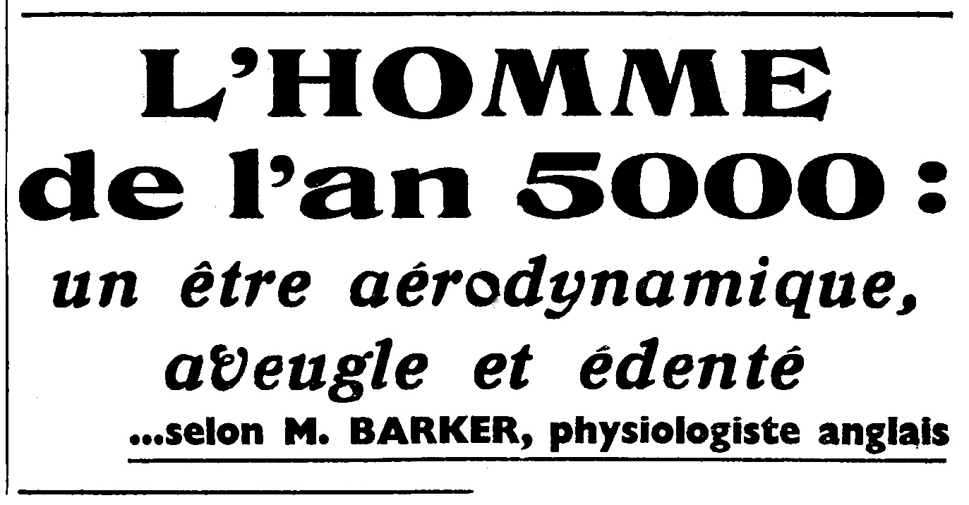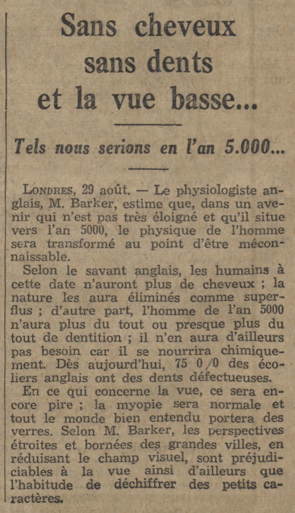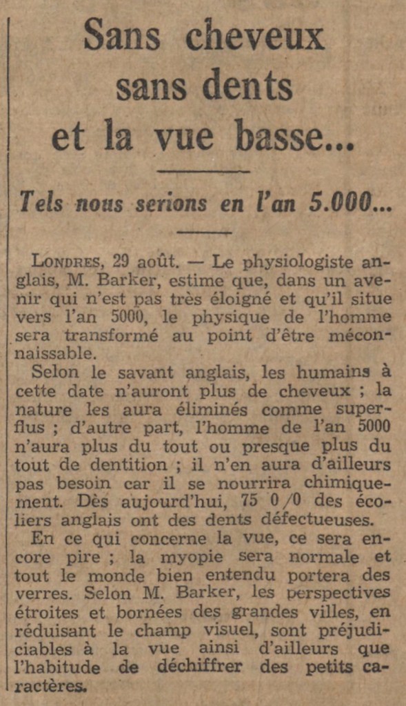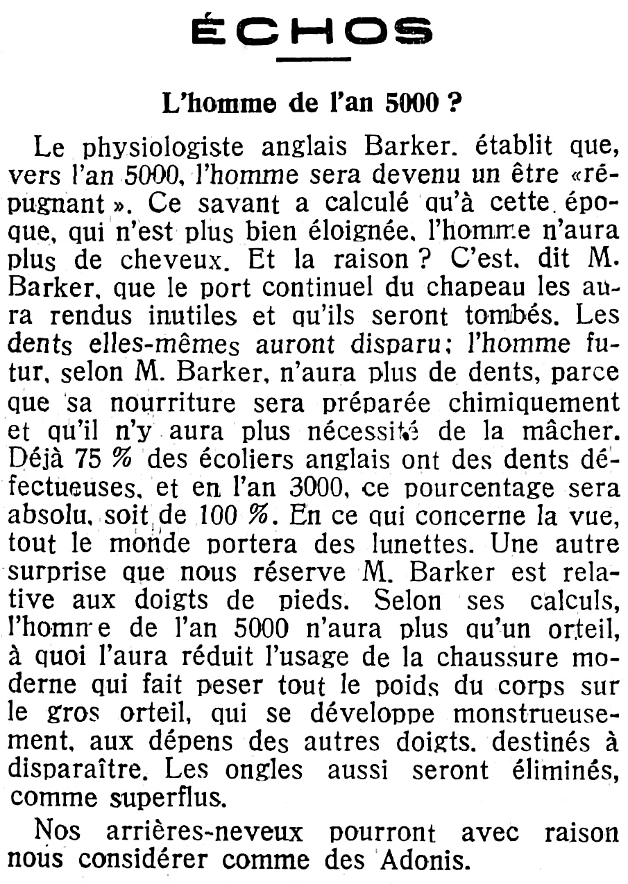 Le célèbre physiologue anglais Barker nous a préparé une déception à ce sujet. Il a fait des études très approfondies qui lui permettent d’affirmer que l’homme de 4937 sera une créature extrêmement laide. D’abord, il n’aura plus de dents, car il ne pourrait pas les utiliser. Sa nourriture, s’il en a toutefois besoin, se composera d’un produit chimique se dissolvant automatiquement dans la bouche. En outre, nos petits-fils n’auront plus de cheveux sur la tête. Car ils porteront toujours un chapeau, adapté à la saison. Leur tête ne demandera donc pas une protection contre le soleil et la pluie. L’autre extrémité de l’homme futur sera encore plus grotesque. Il ne possédera, en effet, qu’un seul orteil, d’une grandeur excessive d’ailleurs, parce qu’il aura la tâche de supporter le poids du corps entier. Cette évolution sera due aux chaussures que nous portons. La démarche de notre petit-fils sera donc aussi élégante que celle d’un éléphant. L’homme de 4937 sera « anatomiquement simplifié » ; il n’aura que quelques côtes. Et il sera dépourvu d’ongles, parce qu’il ne fera aucun travail manuel. Enfin, il sera extrêmement myope.