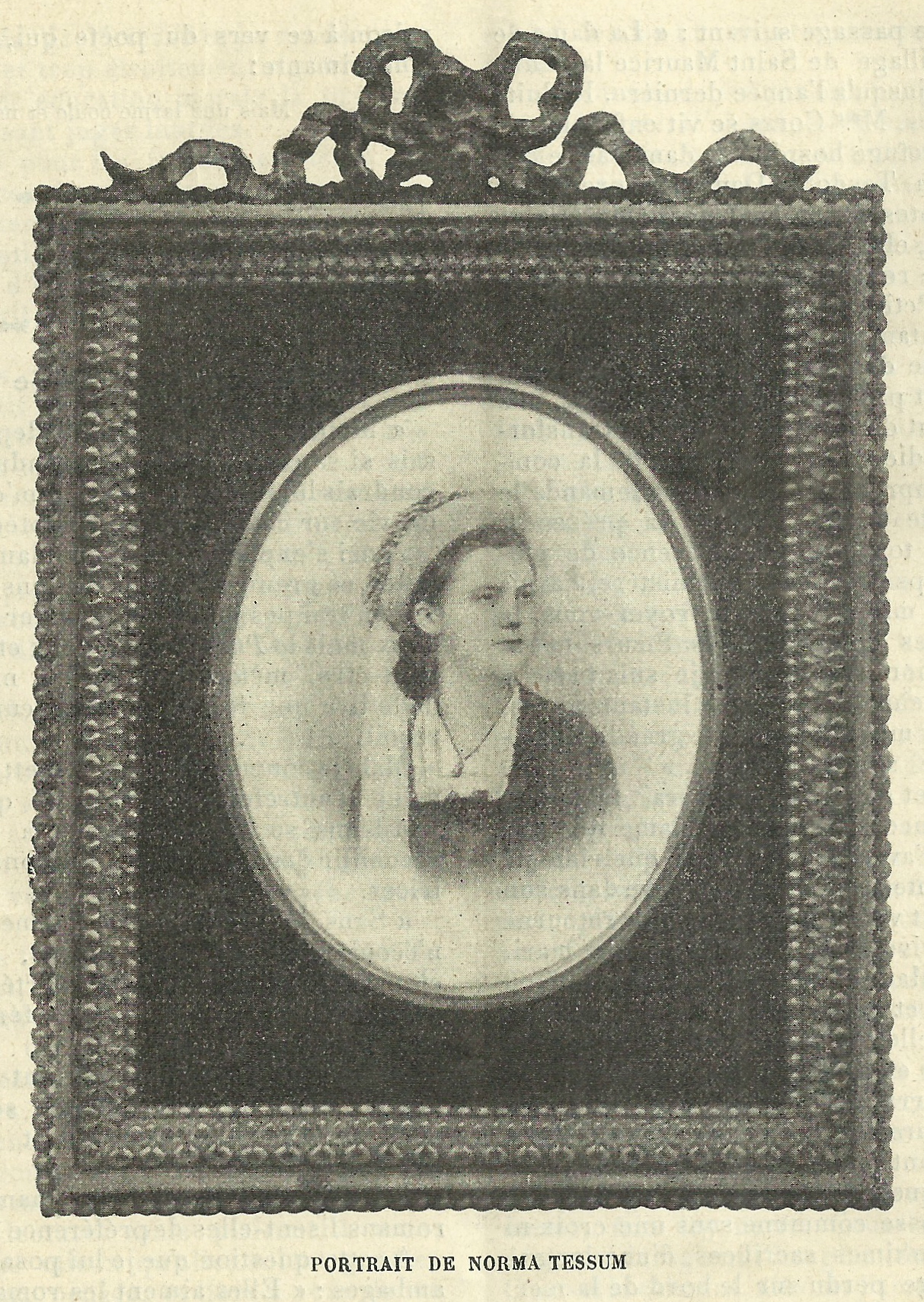 Sur ces premières indications, j’eus vite fait d’écrire à M. Mestres de Pujol, de La Rochelle, et d’en obtenir une photographie du tombeau de Norma Tessum. Mais la miniature acquise par Aurélien Scholl chez un antiquaire de La Rochelle, où la retrouver après la mort du maître chroniqueur et la dispersion de ses biens ? Au cours de cette enquête, j’avais appris qu’un ancien gendarme de Laleu, commune du petit bourg voisin de Saint-Maurice, avait connu particulièrement cette histoire et obtenu même, de la dame Coras, gouvernante de Norma, une photographie de la jeune fille. Après maintes étapes, la lettre que j’écrivis au détenteur du précieux document lui parvint à La Garde, d’où il voulut bien me répondre et m’envoyer cette photographie, dont l’exemplaire après trente-deux ans d’oubli était certainement unique.