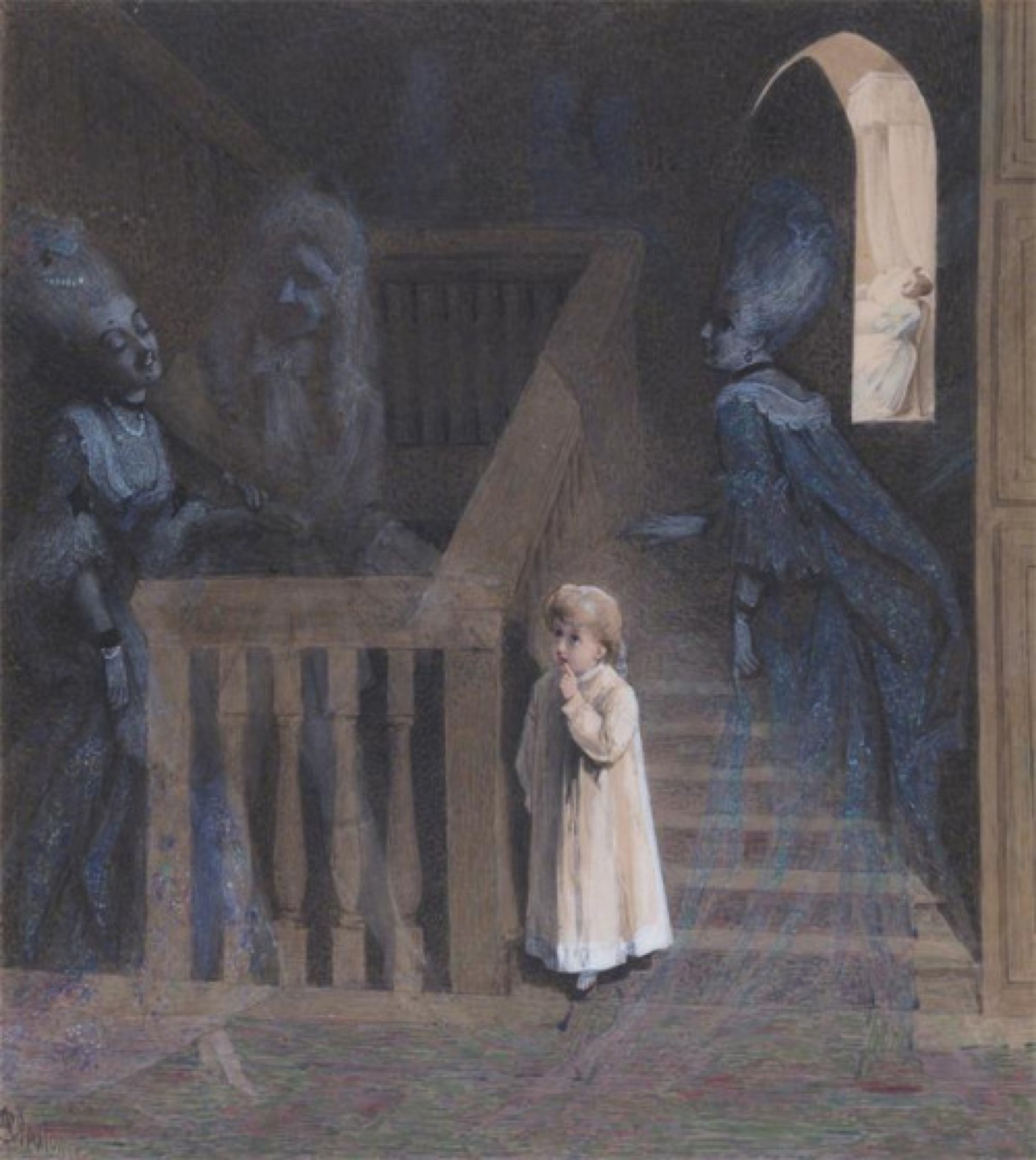 J’ouvris les volets, et, à la lumière incertaine de cette fin de jour coupée d’éclairs, je vis les fantômes. Je les vis partout autour de moi, si menaçants et si terribles que j’en ai encore une angoisse. Ils étaient là, avec leurs visages décomposés, dévorés de moisissure, troués de vers. Et tous, dressés dans un geste de combat, vêtus selon la mode du premier Empire, tendaient en des poses farouches le canon terne d’un pistolet ou la pointe rouillée d’une lance.