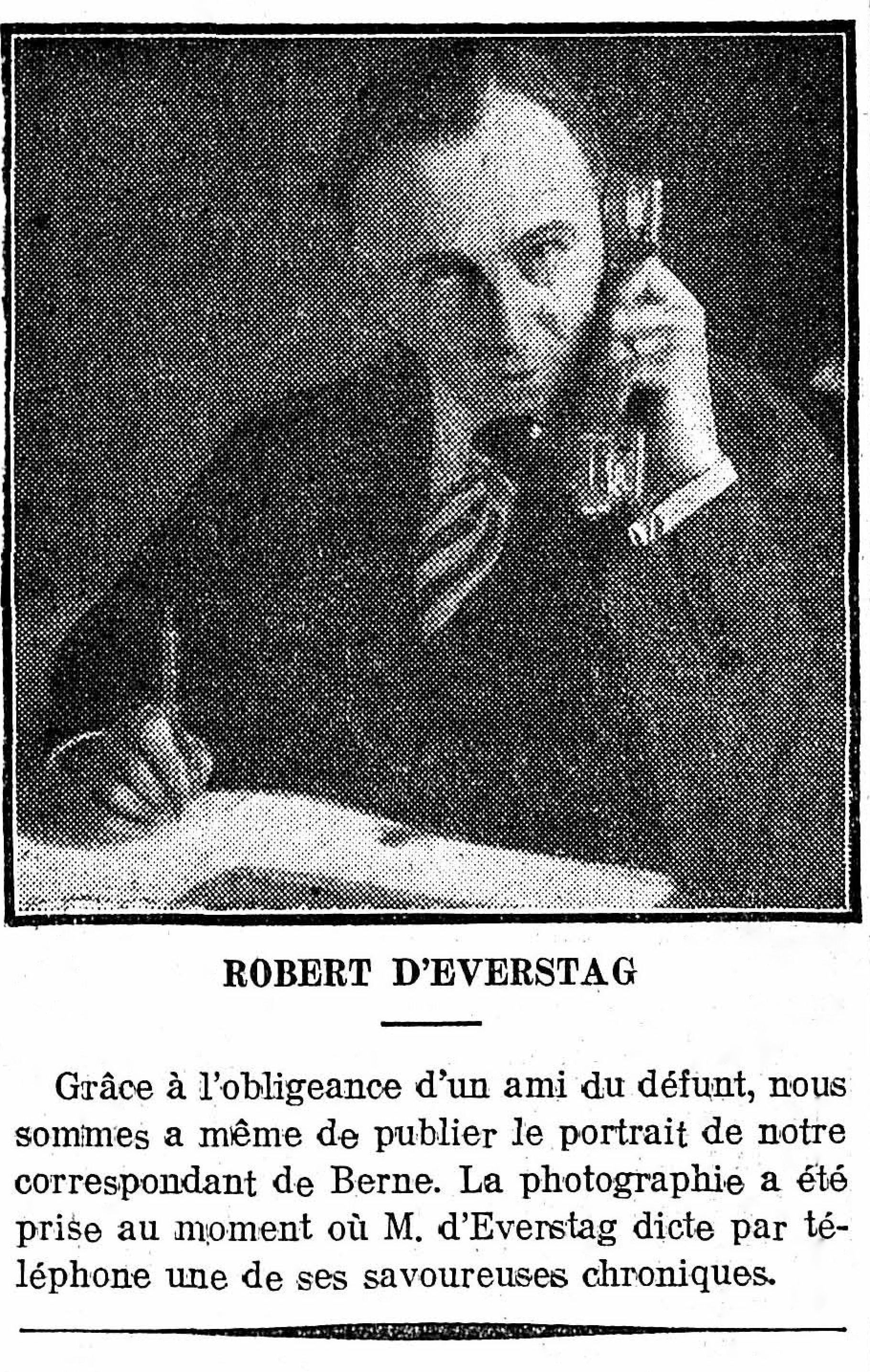 Inutile donc de dire quel courant de sympathie s’était établi entre le publiciste de talent et ses lecteurs. Aussi bien à la Suisse, qu’à l’Impartial et à la Feuille d’Avis, la mort de R.-W. d’Everstag laissera un vide profond. Elle atteindra dans une même mesure le monde de l’automobilisme, de l’aviation et du sport hippique, où le défunt occupait à juste titre une place en vue et où ses avis, toujours donnés dans un français impeccable, – que n’avait pas réussi à entamer l’ambiance fédérale, – étaient reçus avec reconnaissance.