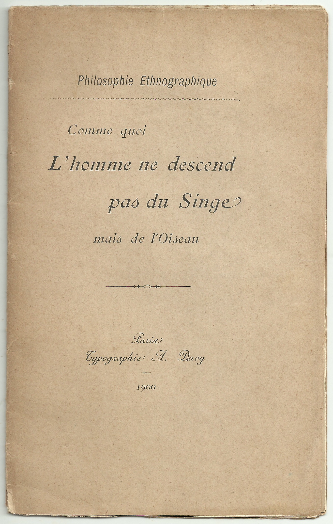On a dit et on a écrit, avec un luxe apparent de preuves, que l’homme tire son origine du singe. Pour des raisons particulières, nous avons jusqu’ici gardé le silence sur cette question, qui a tant flatté l’amour-propre simien.