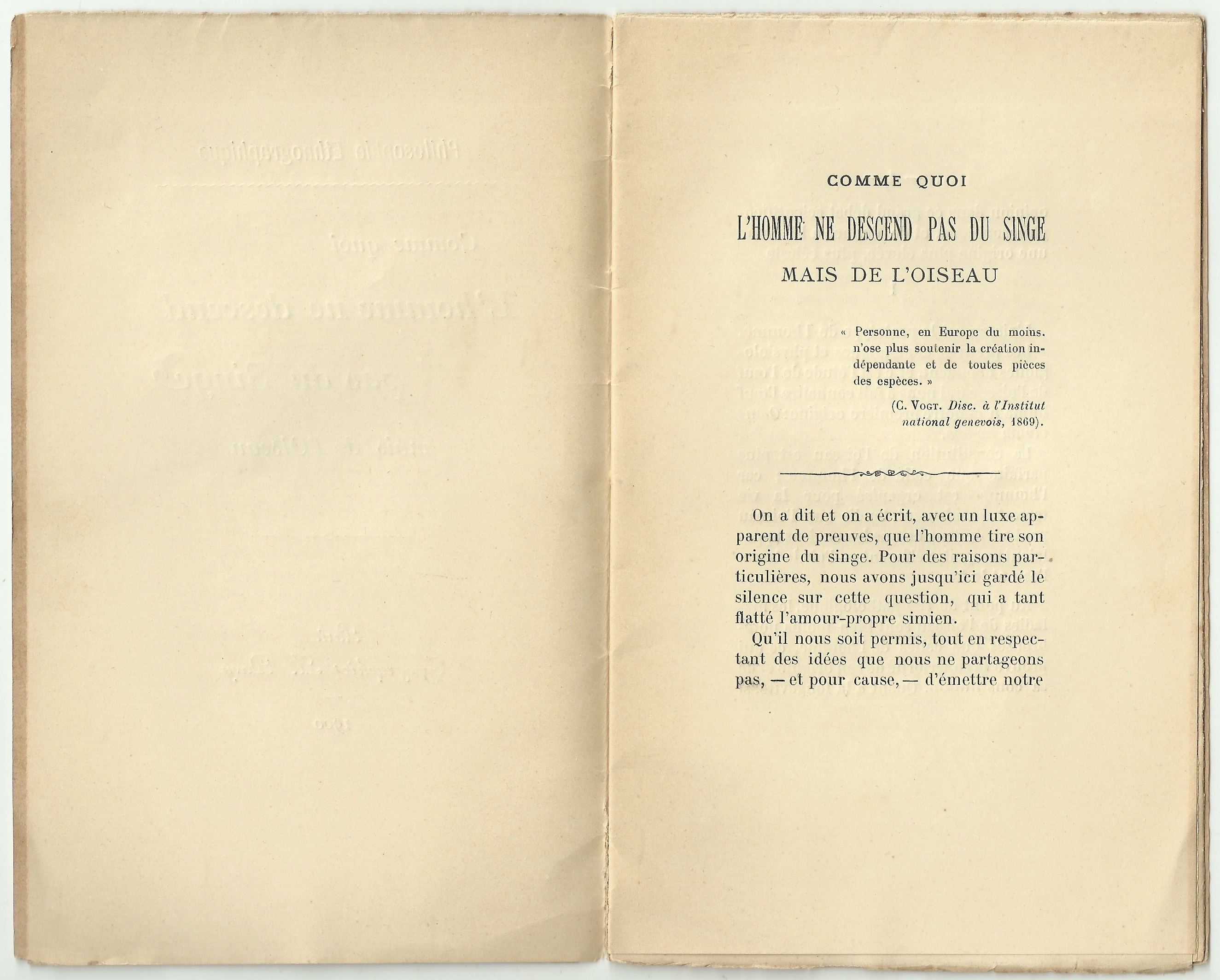 Qu’il nous soit permis, tout en respectant des idées que nous ne partageons pas, – et pour cause, – d’émettre notre opinion dans ce grand débat scientifico-philosophique, et de donner à l’homme une origine plus élevée, plus céleste.