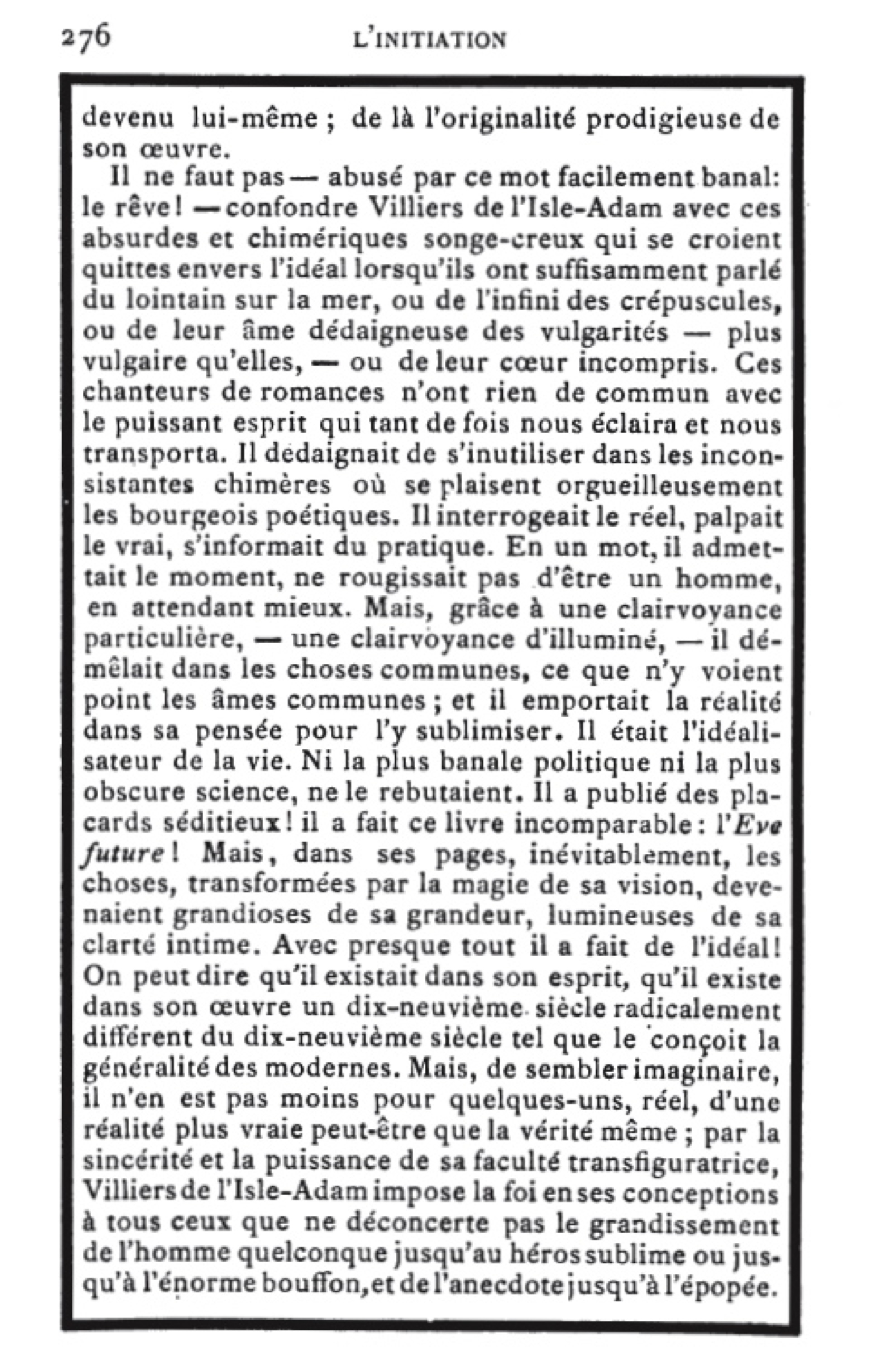 – Vous me causez, monsieur, un très appréciable plaisir. C’est la première fois que l’on me parle ainsi, ou plutôt… » Il s’arrêta un instant. « Voulez-vous me pardonner l’étrangeté de ma confidence, reprit-il, en rougissant légèrement, mais j’ai remarqué – ou cru remarquer – que, lorsque j’adresse la parole à quelqu’un, mon interlocuteur paraît m’entendre plus ou moins bien, suivant le degré de perfection, non de ses organes, mais de son intellect. C’est une expérience que j’ai faite cent fois – et qui ne m’a jamais trompé, acheva-t-il gracieusement.