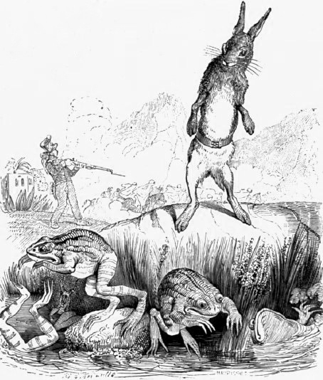 (« Kara », in Arcachon-Journal, journal républicain radical, organe des intérêts balnéaires, maritimes et ostréicoles du littoral, dix-huitième année, 2ème série, n° 2, dimanche 9 janvier 1910 ; illustrations de J.-J. Grandville et de Cham pour « Le Lièvre et les grenouilles » et « Les Oreilles du lièvre » de La Fontaine)