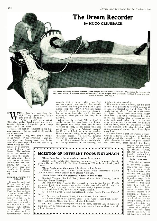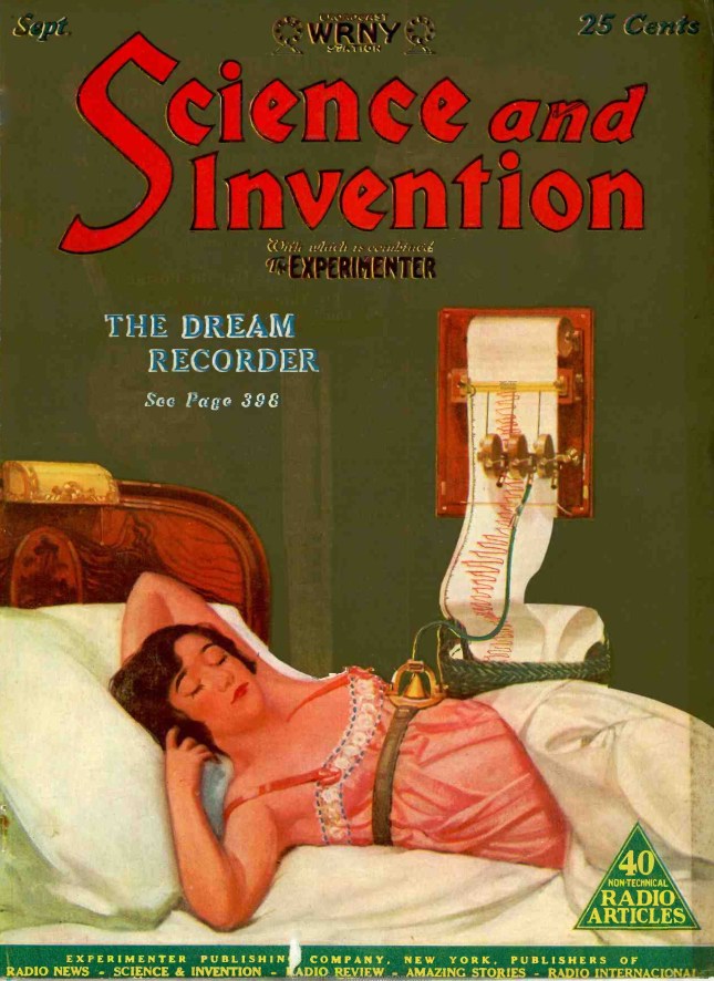 Le professeur Gernsback a consacré à ces recherches toutes les ressources d’une ingéniosité vraiment exceptionnelle et a réussi à mettre au service de ses investigations si délicates les progrès de la technique moderne qui a déjà tant servi la cause de la psychologie expérimentale. Son dernier appareil rend possible l’enregistrement – au sens littéral du mot – du rêve du dormeur.
