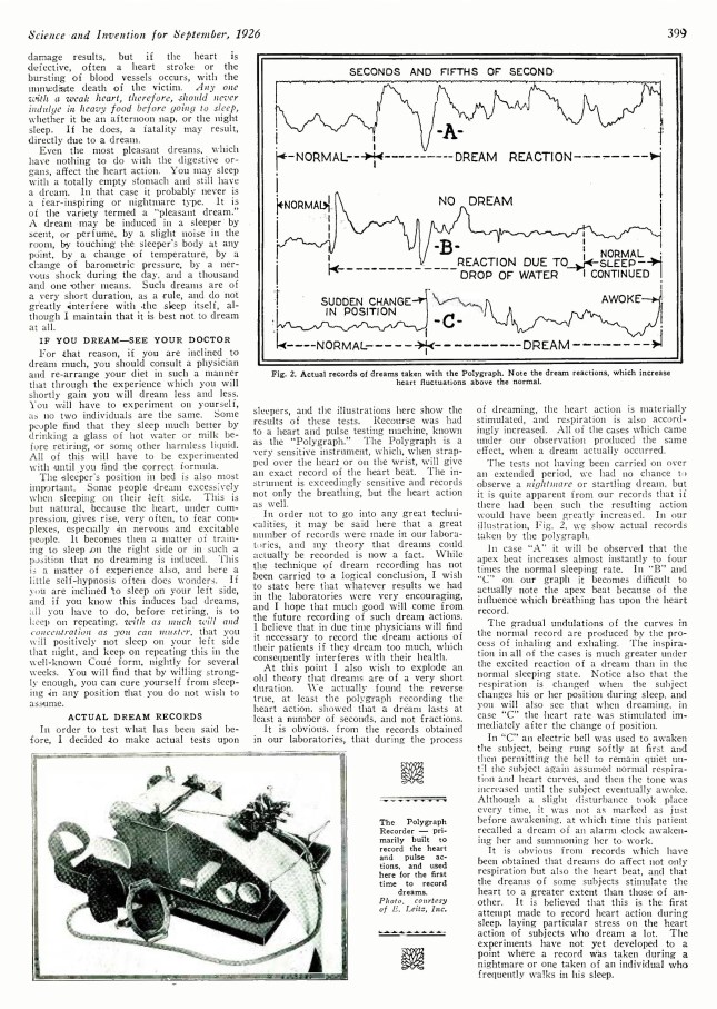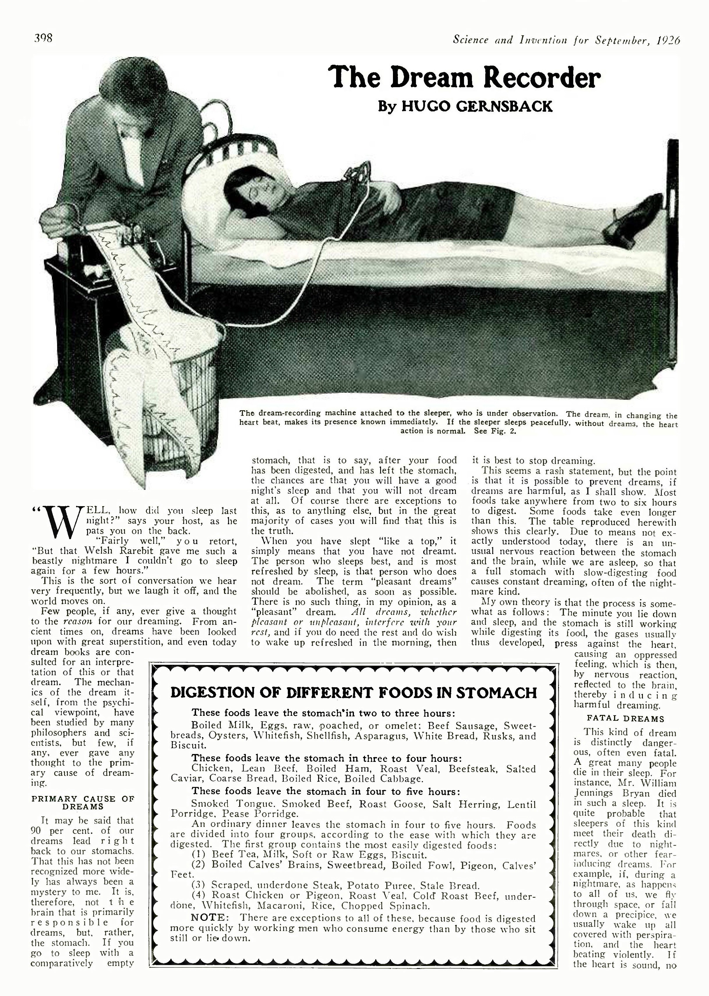 Parti de cette notion que l’activité du cœur est plus grande chez le dormeur qui rêve, le professeur Gernsback a été amené, pour enregistrer les rêves, à concevoir tout naturellement un appareil qui révèle si le dormeur qu’il examine a un rêve et si ce rêve est pénible et désagréable.