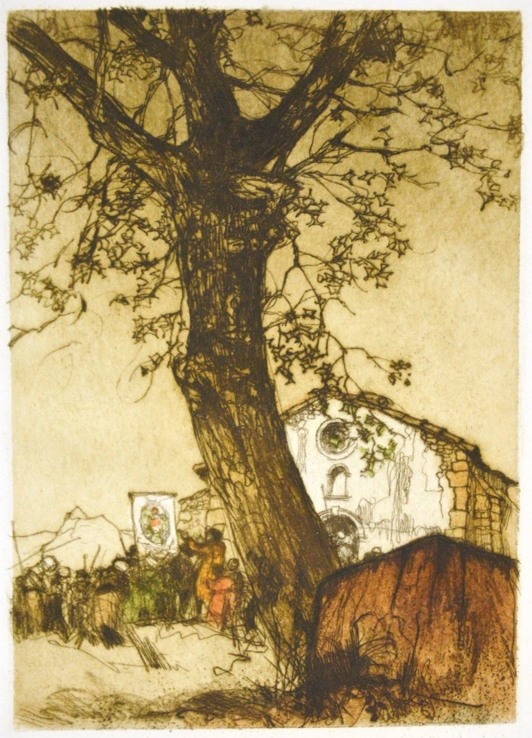 Devant la chapelle, une esplanade taillée dans le roc aplani, piquée de mousses, d’herbes maigres ; et au milieu, entre deux chênes, reste probable d’un bois sacré, un bloc de grès rouge creusé d’un trou.