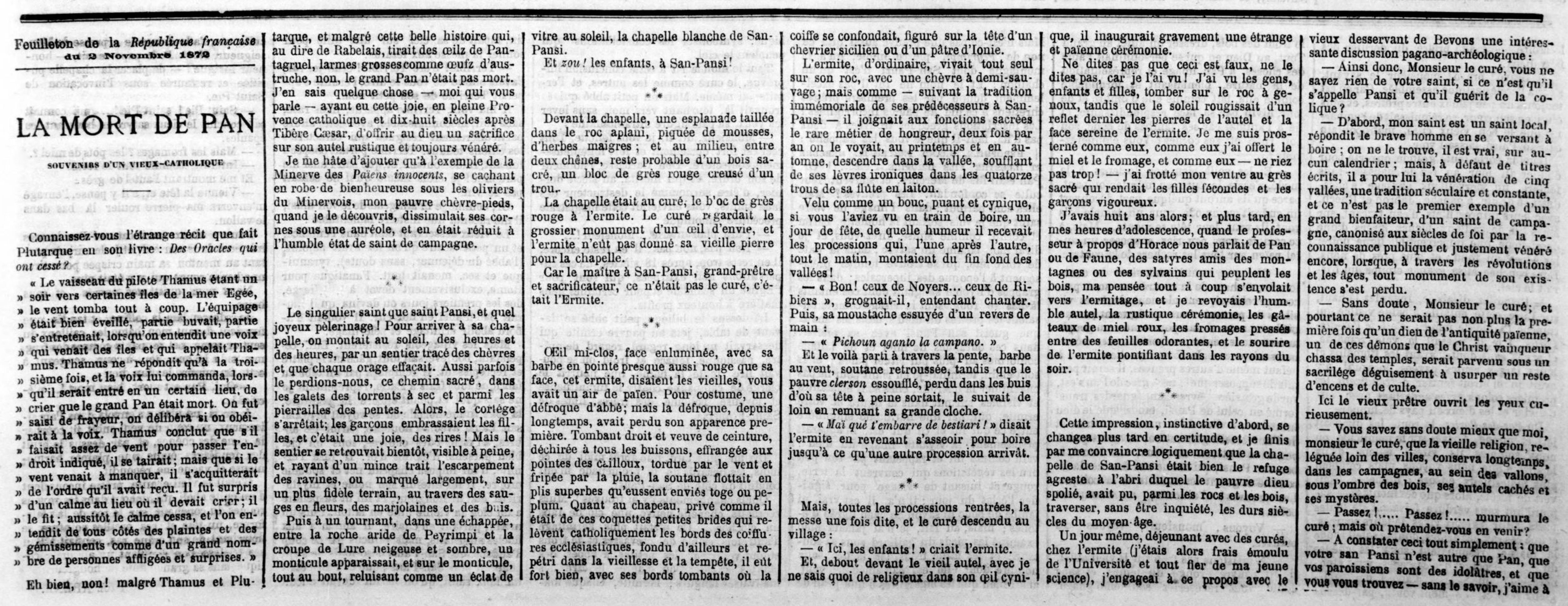 Eh bien, non ! malgré Thamus et Plutarque, et malgré cette belle histoire qui, au dire de Rabelais, tirait, des œilz de Pantagruel, larmes grosses comme œufz d’austruche, non, le grand Pan n’était pas mort. J’en sais quelque chose, – moi qui vous parle, – ayant eu cette joie, en pleine Provence catholique et dix-huit siècles après Tibère Cæsar, d’offrir au dieu un sacrifice sur son autel rustique et toujours vénéré.