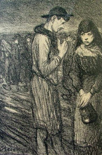 Là-dessus, le bilieux petit abbé, se levant, jeta au pauvre ermite qui desservait la table un long regard, regard de prêtre, passionné, tenace et froid, où se pouvait lire toute la haine que nourrit le clergé de campagne contre la tumultueuse et joyeuse bohème des frères libres de Saint-François.