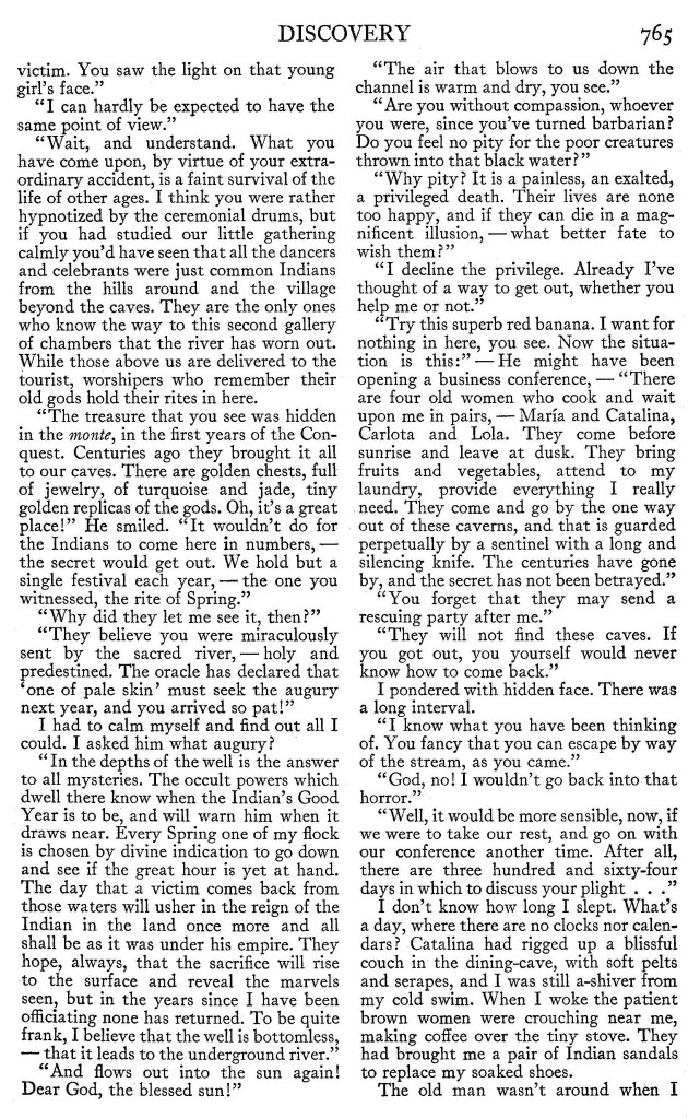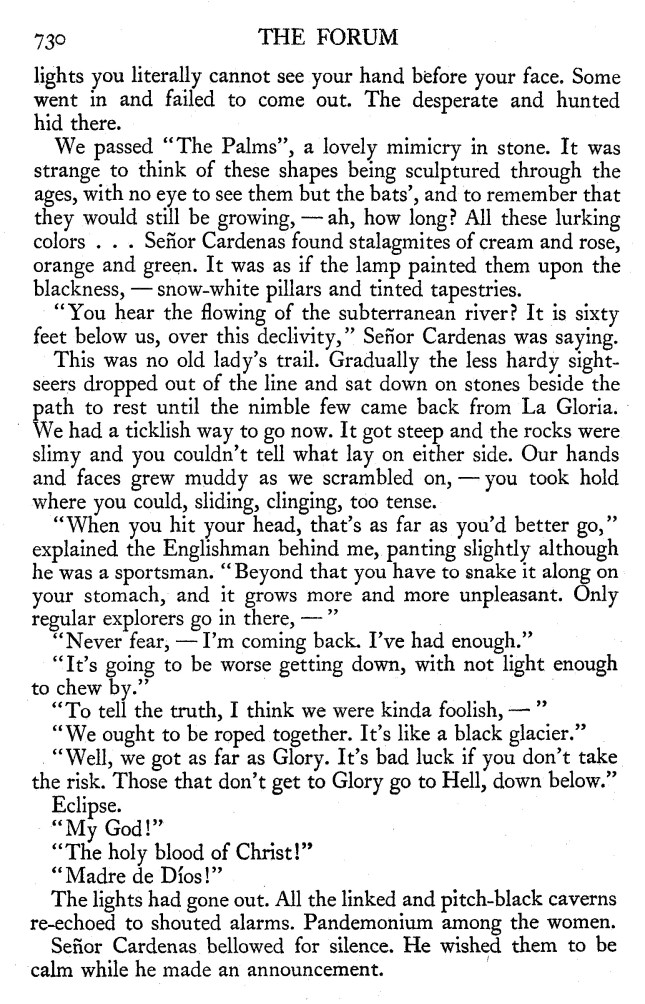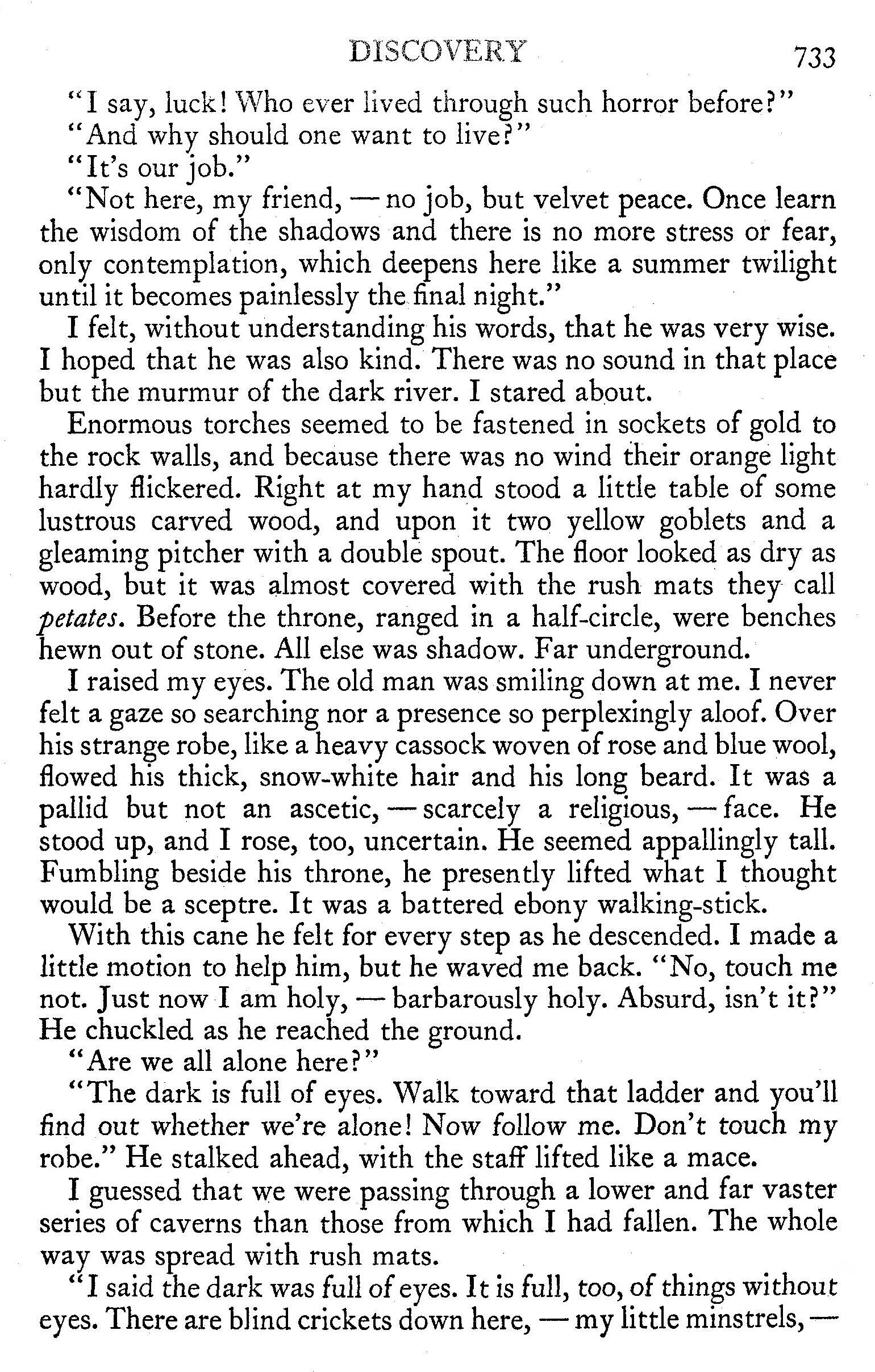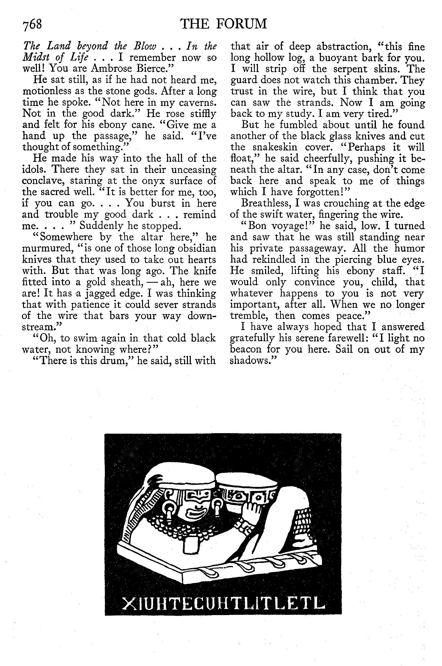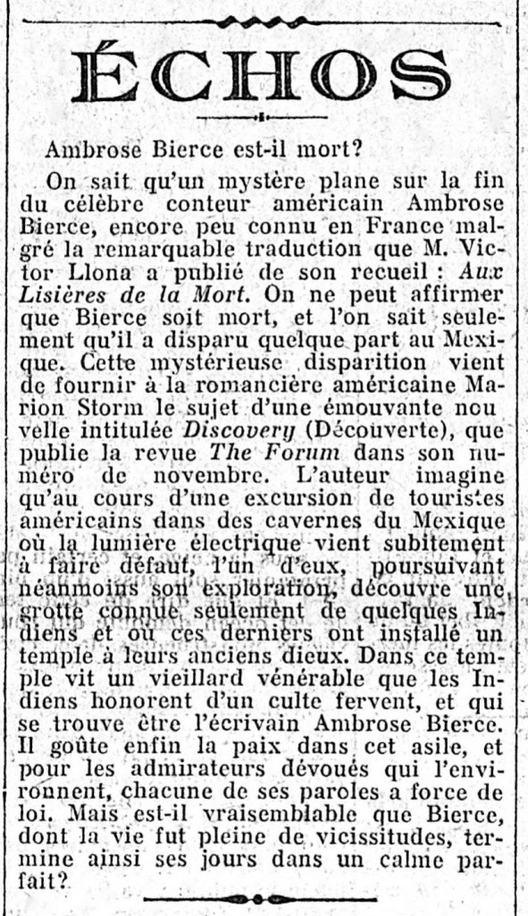 On sait qu’un mystère plane sur la fin du célèbre conteur américain Ambrose Bierce, encore peu connu en France malgré la remarquable traduction que M. Victor Llona a publié de son recueil Aux Lisières de la Mort. On ne peut affirmer que Bierce soit mort, et l’on sait seulement qu’il a disparu quelque part au Mexique. Cette mystérieuse disparition vient de fournir à la romancière américaine Marion Storm [sic, pour Marian] le sujet d’une émouvante nouvelle intitulée Discovery (Découverte), que publie la revue The Forum dans son numéro de novembre. L’auteur imagine qu’au cours d’une excursion de touristes américains dans des cavernes du Mexique où la lumière électrique vient subitement à faire défaut, l’un d’eux, poursuivant néanmoins son exploration, découvre une grotte connue seulement de quelques Indiens et où ces derniers ont installé un temple à leurs anciens dieux. Dans ce temple vit un vieillard vénérable que les Indiens honorent d’un culte fervent, et qui se trouve être l’écrivain Ambrose Bierce. Il goûte enfin la paix dans cet asile, et pour les admirateurs dévoués qui l’environnent, chacune de ses paroles a force de loi. Mais est-il vraisemblable que Bierce, dont la vie fut pleine de vicissitudes, termine ainsi ses jours dans un calme parfait ?