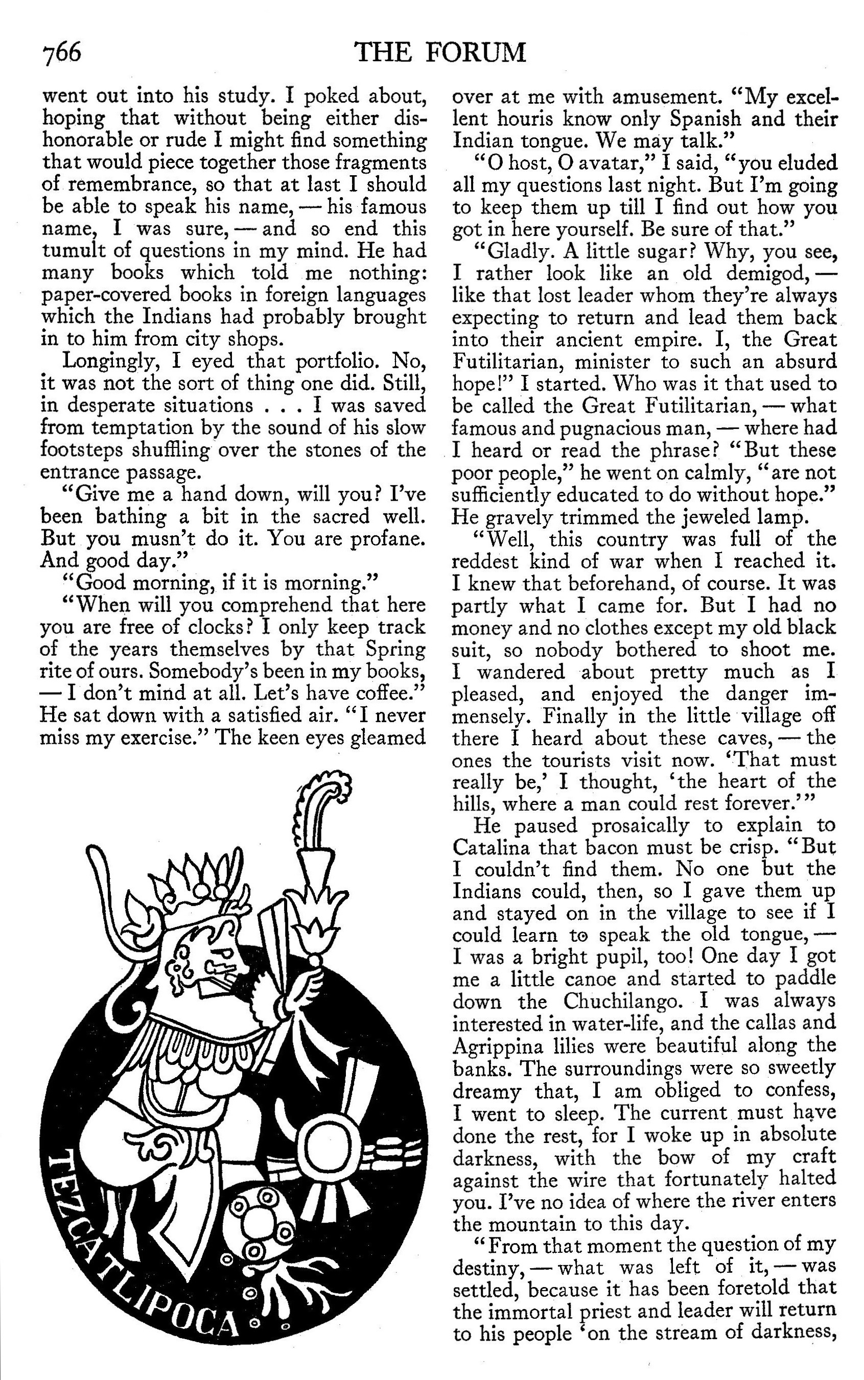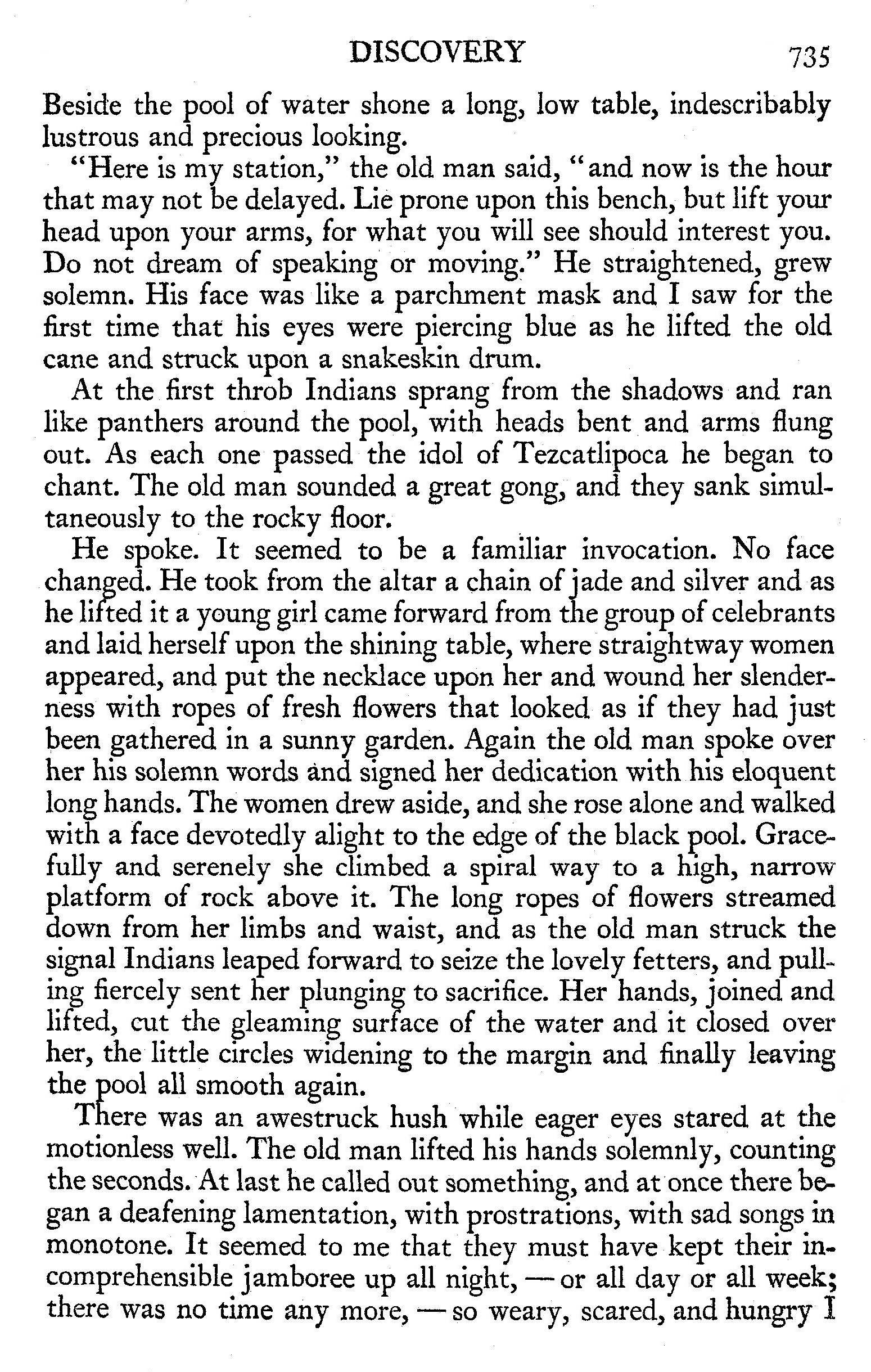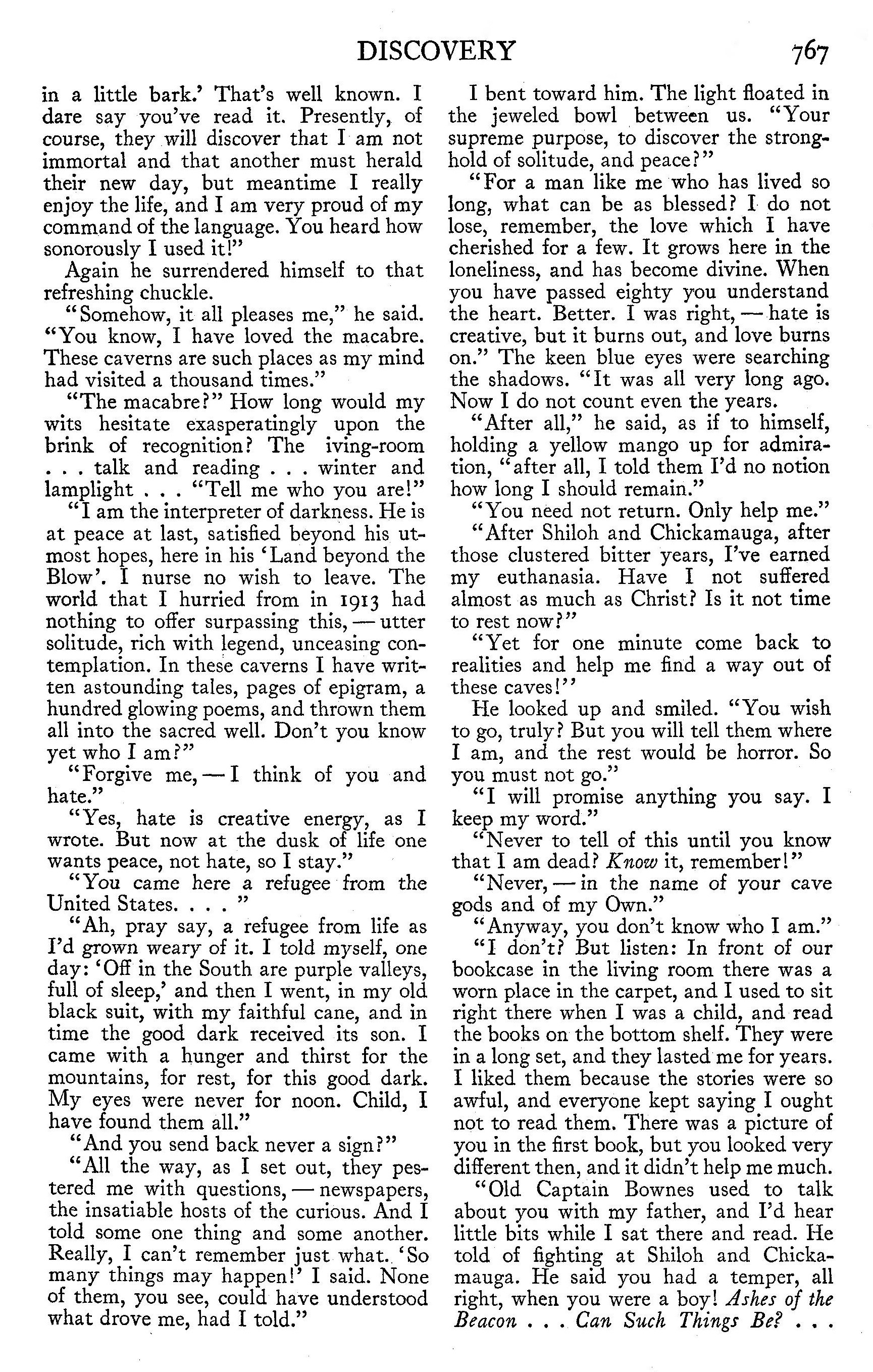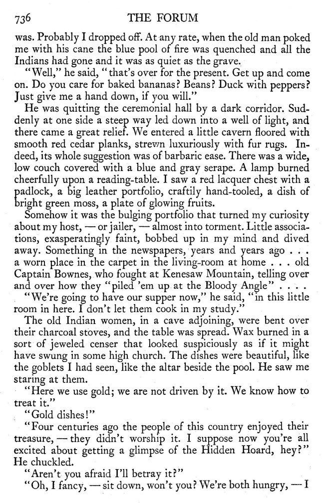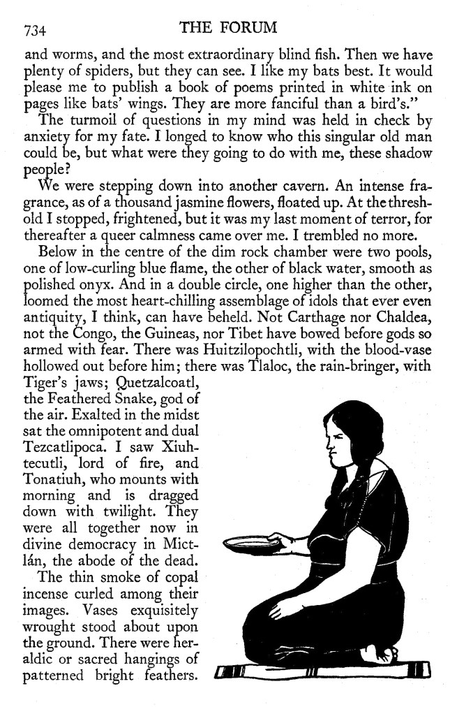 On sait qu’un mystère plane sur la fin du célèbre conteur américain Ambrose Bierce, encore peu connu en France malgré la remarquable traduction que M. Victor Llona a publié de son recueil Aux Lisières de la Mort. On ne peut affirmer que Bierce soit mort, et l’on sait seulement qu’il a disparu quelque part au Mexique. Cette mystérieuse disparition vient de fournir à la romancière américaine Marion Storm [sic, pour Marian] le sujet d’une émouvante nouvelle intitulée Discovery (Découverte), que publie la revue The Forum dans son numéro de novembre. L’auteur imagine qu’au cours d’une excursion de touristes américains dans des cavernes du Mexique où la lumière électrique vient subitement à faire défaut, l’un d’eux, poursuivant néanmoins son exploration, découvre une grotte connue seulement de quelques Indiens et où ces derniers ont installé un temple à leurs anciens dieux. Dans ce temple vit un vieillard vénérable que les Indiens honorent d’un culte fervent, et qui se trouve être l’écrivain Ambrose Bierce. Il goûte enfin la paix dans cet asile, et pour les admirateurs dévoués qui l’environnent, chacune de ses paroles a force de loi. Mais est-il vraisemblable que Bierce, dont la vie fut pleine de vicissitudes, termine ainsi ses jours dans un calme parfait ?