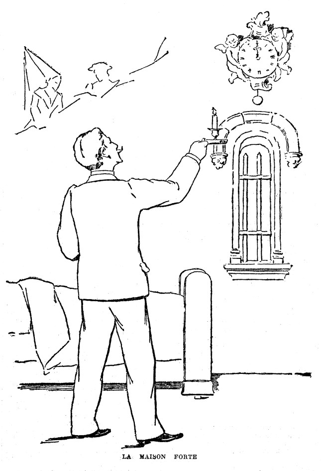 Rien de particulier, d’ailleurs, dans cette chambre aux grands murs nus, dont le papier se détachant laissait par place entrevoir les personnages d’une tapisserie en lambeaux, rien si ce n’est, avec un indéfinissable parfum de tristesse et d’abandon au-dessus de la fenêtre, un vieux cartel dont le cadran que soutenaient des amours en bronze, disparaissait sous une épaisse couche de poussière, oubliée par le plumeau d’Angéline.