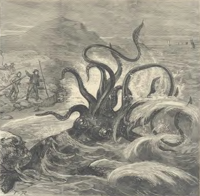 Là, le colosse a été jeté par l’ouragan. Va-t-il triompher ou mourir ? Les pêcheurs, qui se gardent bien d’approcher, contemplent, stupéfaits, ce saisissant tableau, ce monstre horrible dont les tentacules s’agitent et se tordent comme de grands reptiles battant les flots.