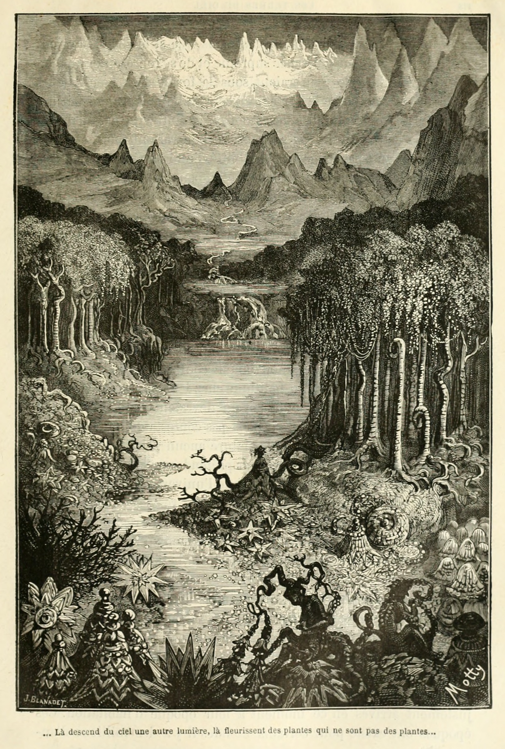 « … Messieurs, je viens de remonter le canal sur une longueur de quelque trois cents milles et j’arrive présentement à ce qui paraît être une sorte de réservoir… C’est comme un grand lac, large d’une dizaine de lieues… De ce lac partent en rayonnant cinq canaux pareils à celui que je viens de suivre… Au centre de ce lac, je constate un mouvement très apparent, comme une sorte de puissant tourbillon, et au-dessus de ce tourbillon des centaines de formes indistinctes s’agitant dans les airs… Les mouvements de ces formes sont lents et méthodiques ; ils semblent indiquer un dessein arrêté plutôt qu’une curiosité vaine… Plongeant dans les eaux tumultueuses ou en émergeant avec une régularité également calme et méthodique, d’autres formes sont évidemment engagées dans un travail quelconque… Ah ! maintenant, ma lunette porte perpendiculairement sur le centre du lac !… Je tiens la clef du mystère !… J’aperçois de profil les bords de plusieurs éventails gigantesques, disposés par séries comme les aubes de quelque roue colossale et tournant avec une rapidité vertigineuse… Imaginez un engin hydraulique de trois ou quatre cents mètres de large, tournant à raison d’une centaine de pieds par seconde, enlevant et rejetant dans le réservoir qu’il alimente un volume d’eau suffisant pour alimenter cinq canaux aussi larges que le Mississippi – et vous aurez une idée approchée de cette merveille industrielle !… Et le plus étonnant, c’est qu’il est impossible de voir quelle force le met en action… Mais regardez plutôt vous-mêmes, messieurs ! »