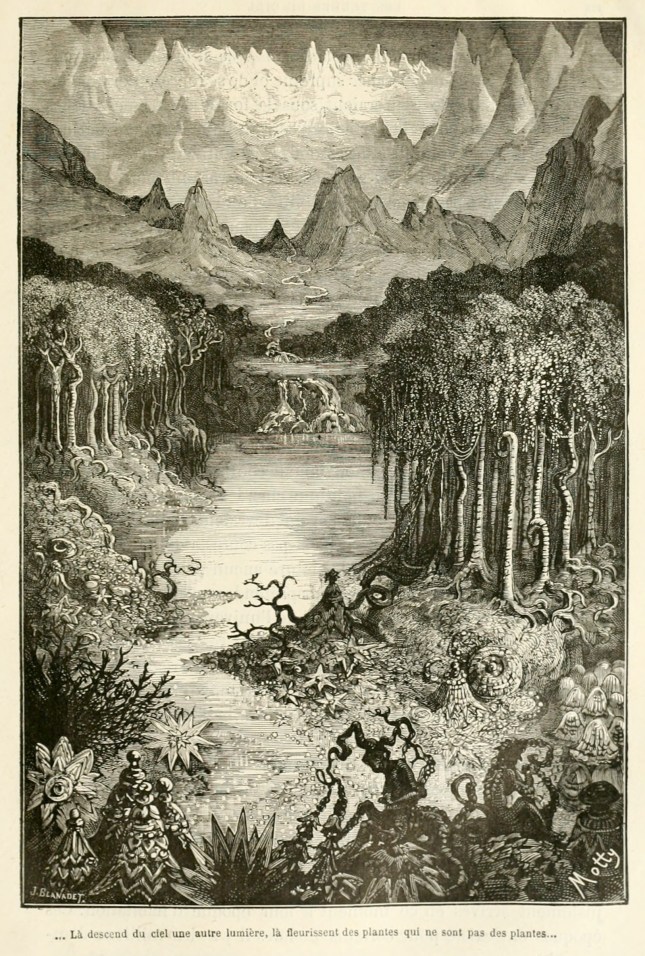« Ah ! voici du nouveau… Un grand bateau amarré au bord du canal et qu’un seul homme suffit à décharger, sans la moindre peine, à ce qu’il semble. Il pose simplement la main sur une caisse, – il y en a des centaines, toutes énormes, longues et larges de trois ou quatre mètres, – l’enlève dans les airs, flotte avec elle vers la rive et l’y laisse, pour recommencer son exploit… Mais le canal fuit toujours et j’entrevois à l’horizon ce qui m’a tout l’air d’être la mer… oui, c’est une nappe d’eau sans limites… Le canal – c’est évidemment un canal – y aboutit. Encore quelques minutes et nous serons à l’embouchure… Il y a une ville !… Elle est encore à trente milles au moins, mais rien que par la beauté et la splendeur de ses monuments qui brillent tout blancs au soleil, je puis affirmer qu’elle est grande et populeuse… La ville approche… J’en distingue déjà les grandes lignes… Les édifices paraissent construits en marbre ; ils sont colossaux pour la plupart, admirablement symétriques et de style grec (!)… Mais la mer !… Voici ce qui me confond !… Elle est séparée du canal, qui s’y jette, par une écluse immense ! Cette écluse et les rues voisines sont couvertes d’habitants, qui flottent paisiblement dans l’air ; la distance ne me permet pas de distinguer leurs traits ou leurs costumes, mais les uns et les autres semblent semblables aux nôtres… »