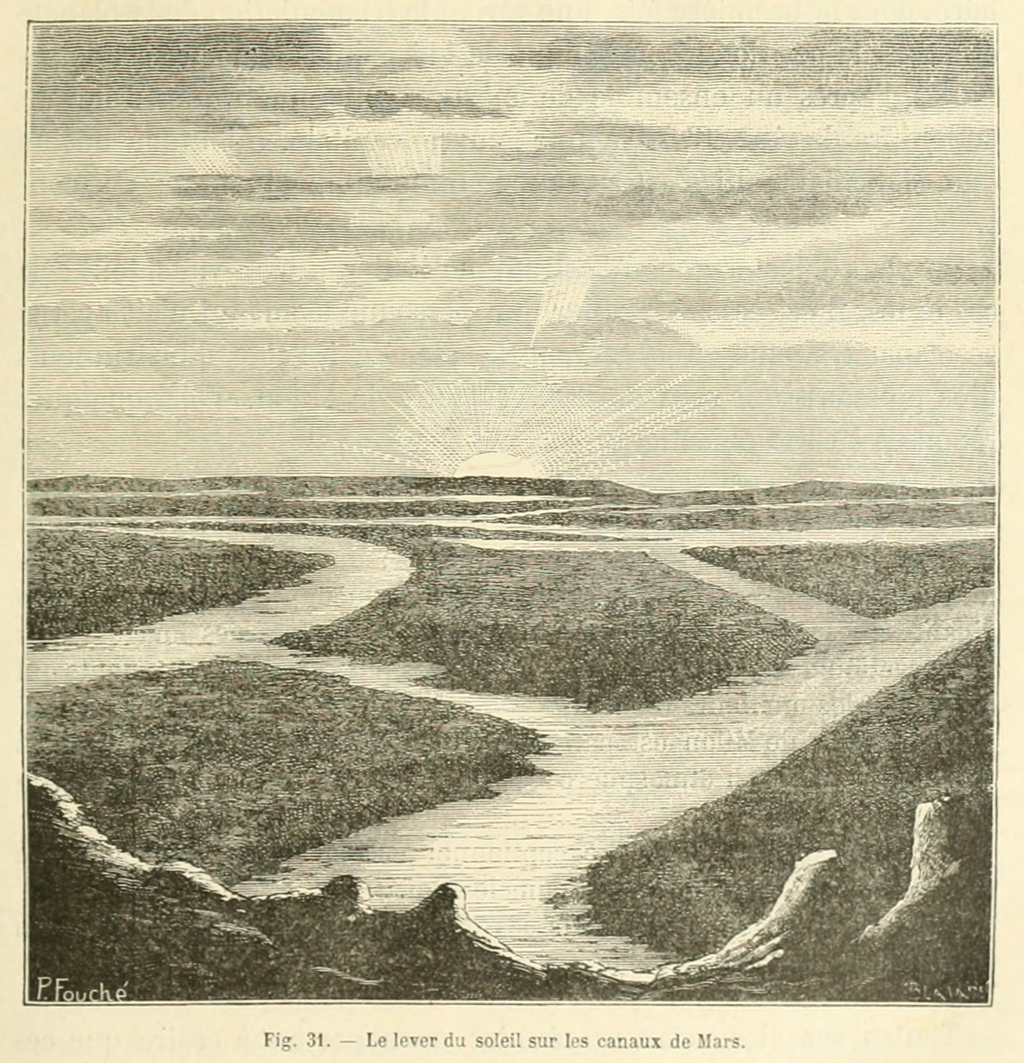 (« Lectures étrangères : une hypothèse sur les canaux de la planète Mars, » in Le Temps, vingt-huitième année, n° 9924, mercredi 4 juillet 1888 ; gravures de P. Fouché, J. Blanadet et Motty, extraites de l’ouvrage de Camille Flammarion, Les Terres du ciel, voyage astronomique sur les autres mondes, Paris : Marpon & Flammarion, 1884)