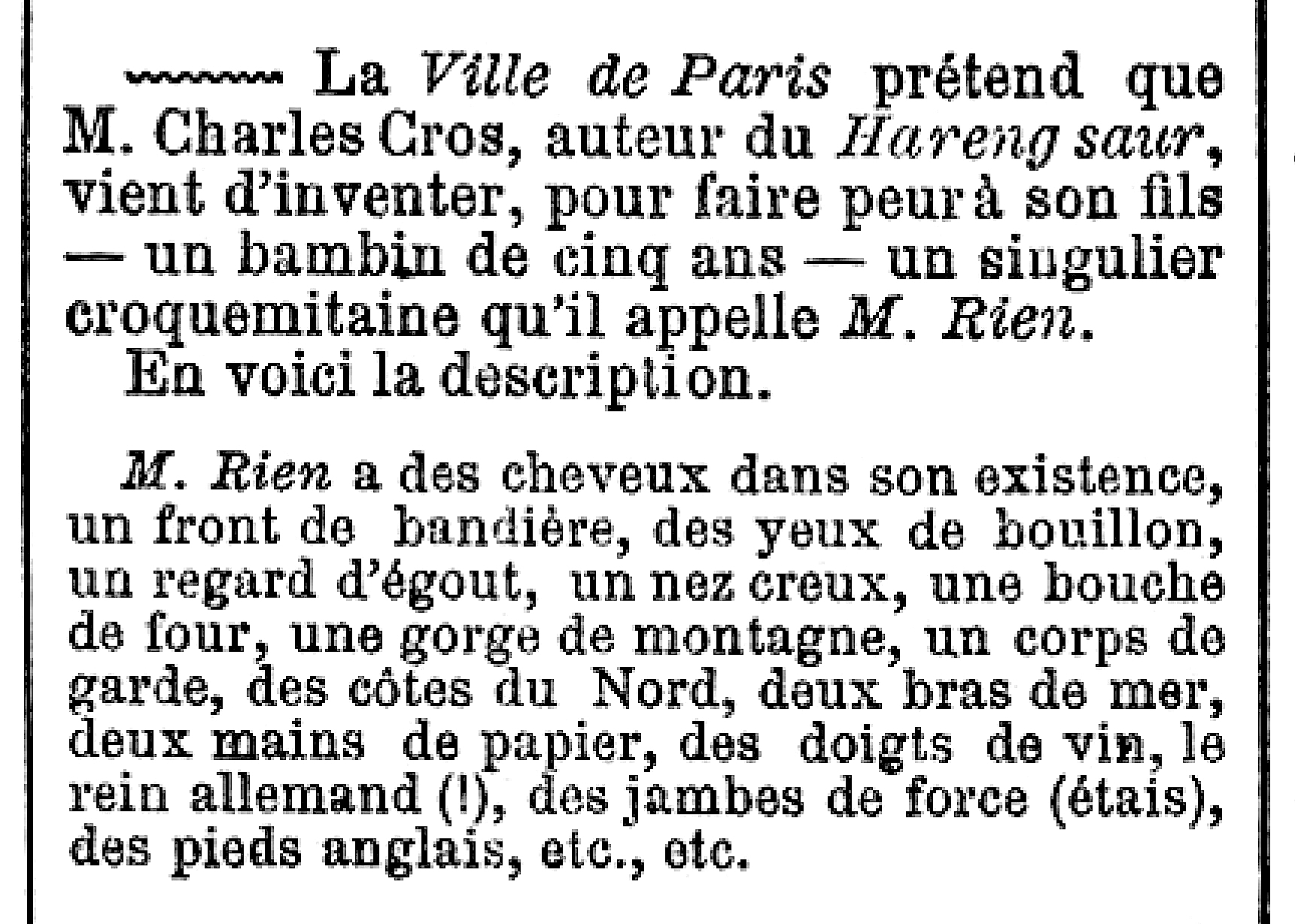 M. Rien a des cheveux dans son existence, un front de bandière, des yeux de bouillon, un regard d’égout, un nez creux, une bouche de four, l’oreille du ministre, une gorge de montagne, un corps de garde, des côtes du Nord, deux bras de mer, deux mains de papier, des doigts de vin, le rein allemand (!), un c… de sac, des jambes de force (étais), des chevilles de tonneau, des pieds anglais, etc., etc.