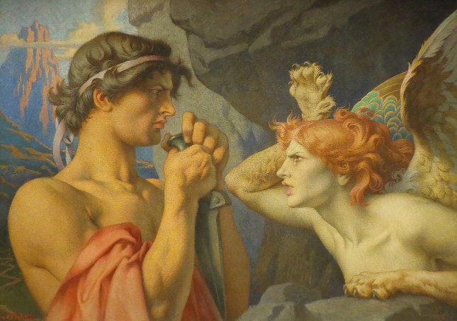 (Maurice Noury, « Les Contes du Petit Journal, » in Le Petit Journal, n° 24403, vendredi 8 novembre 1929. François-Émile Ehrmann, « Œdipe et le Sphinx, » huile sur toile, 1903 ; Fernand Khnopff, « Des Caresses, » huile sur toile, 1896)