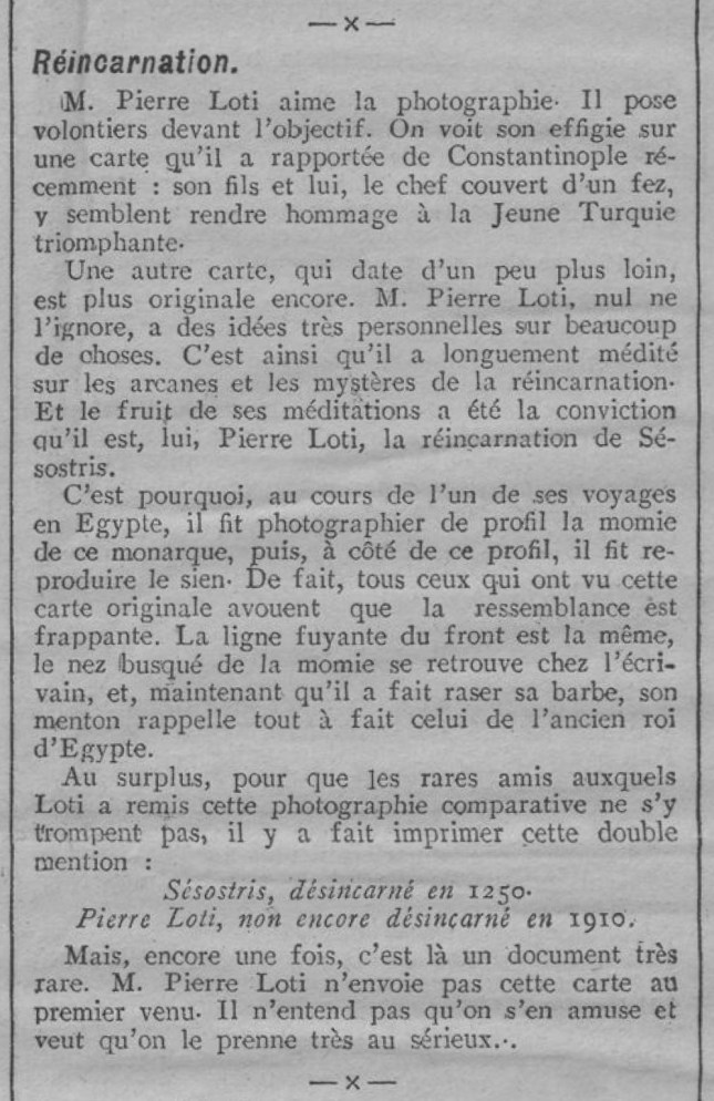 Il y a quelques années, nous étions quelques camarades qui, à force de nous rencontrer chez les mêmes antiquaires et chez les mêmes libraires, avions pris l’habitude de nous retrouver tantôt chez l’un, tantôt chez l’autre, à l’heure du thé et du porto pour y causer des choses qui nous étaient chères et qui ne ressemblaient pas beaucoup, j’en ai peur, aux préoccupations familières de nos contemporains. Tous, nous étions des gens fort sages, assez détachés des passions de ce bas-monde, curieux de tout et surtout de littérature et de bibelots. Tel était M. Orpaquin, qui vivait au milieu d’une admirable et féerique collection de vieilles dentelles et qui, avec sa longue redingote aux basques voltigeantes et ses lunettes vertes, avait l’air d’une de ces grosses libellules au regard myope qui tournoient au-dessus des bassins d’eau stagnante ; tel aussi M. de Sancy, qui avait vécu longtemps en Russie pour y étudier l’influence française au dix-huitième siècle. Quant à M. de Clairette, il n’aimait que l’art chinois et l’art japonais et avait assez l’aspect de quelque Bouddha serein et radieux. Outre ces personnages, notre petit groupe comptait encore quelques autres maniaques, fanatiques de culture et de passé, perdus dans leur rêve archaïque ou exotique, dont plusieurs, qui savaient tout de l’univers, n’avaient jamais quitté leur appartement du quai Voltaire ou leur logis de la rue de Verneuil.