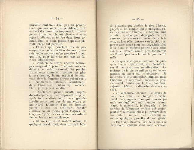 Et bien souvent encore, les nuits suivantes, la bête-femme gratta à la porte et s’enfuit sans oser entrer. Les Betsimisarakes avaient peur, parce que ce n’est pas bon signe, quand leur ancêtre revient. Et ils crurent que c’était pour ça qu’un de leurs chiens prit un jour la rage. Il s’échappa en bavant sur les pierres, et je dis qu’il fallait l’abattre, avec tous les autres qu’il avait peut-être mordus. Mais l’enragé courut, sans qu’on pût l’atteindre, vers le côté où il n’y avait pas d’eau, vers la forêt ! Et, à partir de ce moment, je n’eus plus qu’une idée :