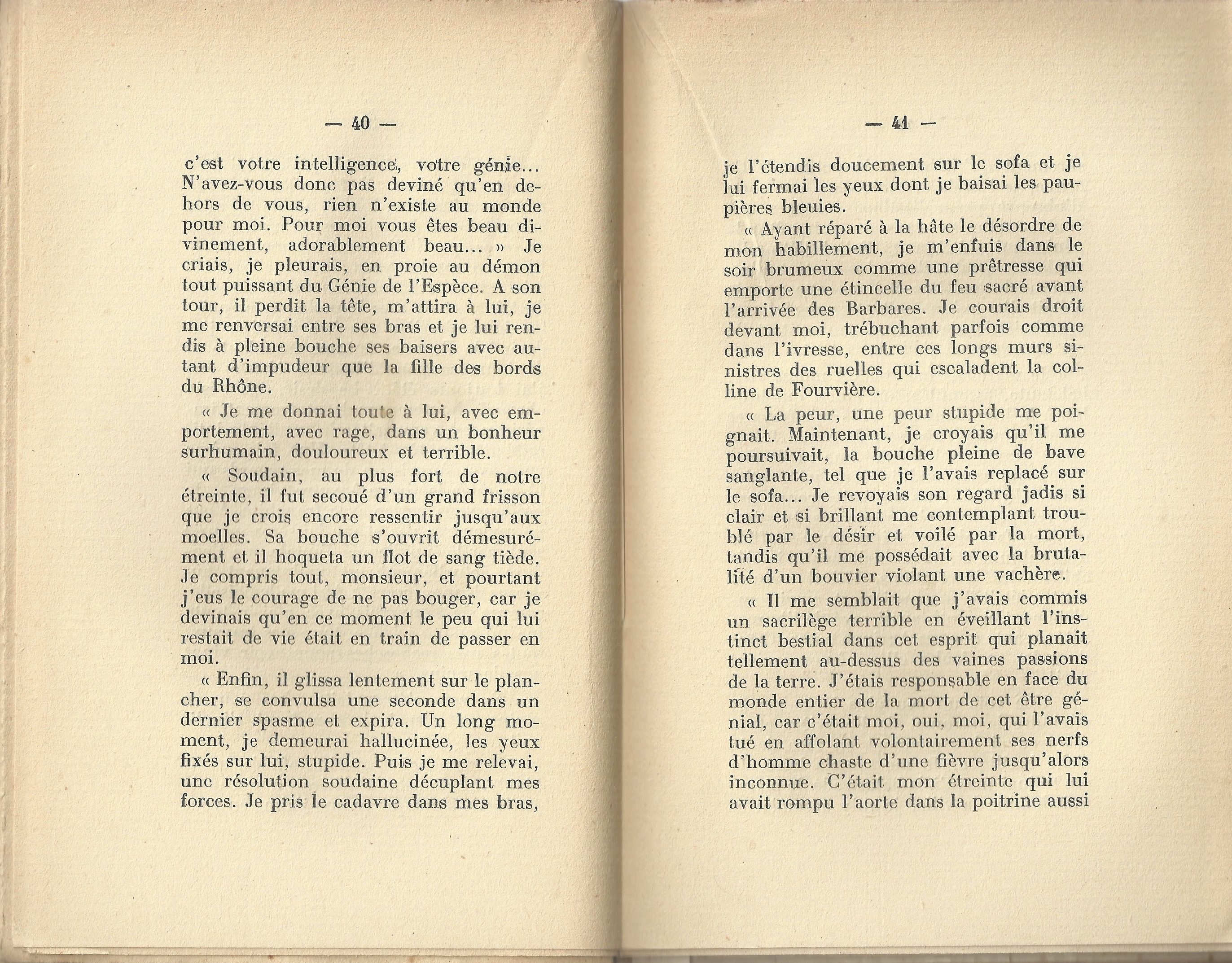 Ah ! comme elle était câline ! Et c’est pour ça que j’ai dit à Barnavaux, dans le temps, que l’homme ne venait pas du singe, comprenez-vous, mais d’une bête pareille. Les singes sont méchants, colères, sans mémoire, et sales, et vilains dans leurs gestes. Vous le savez bien ! De voir un singe faire l’amour, on prendrait dégoût de l’amour pour toute sa vie. Tandis qu’elle, le fond de son être, c’était la bonté. Comme les hommes, après tout : les hommes sont bons, si vous y réfléchissez. S’ils n’étaient pas bons, ils ne seraient pas devenus ce qu’ils sont aujourd’hui. S’ils étaient mauvais, avec leur intelligence, ils seraient toujours des satans. On a tant d’intérêt à être des satans ! Mais on ne peut pas, voilà la vérité.