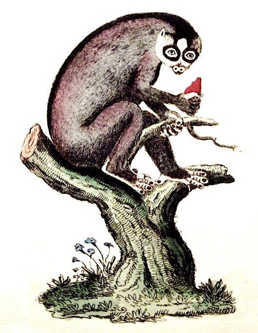 (Pierre Mille, « Contes du Journal, » in Le Journal, n° 6622, dimanche 13 novembre 1910 ; cette nouvelle a été reprise dans le « roman » Louise et Barnavaux, Paris : Calmann-Lévy, 1912 ; « Der Maücaüco, » lithographie de Johann Sebastz, George Edwards, c. 1750-1775 ; « Tail-Less Maucauco, » gravure extraite de The Naturalist’s Pocket Magazine, novembre 1799)