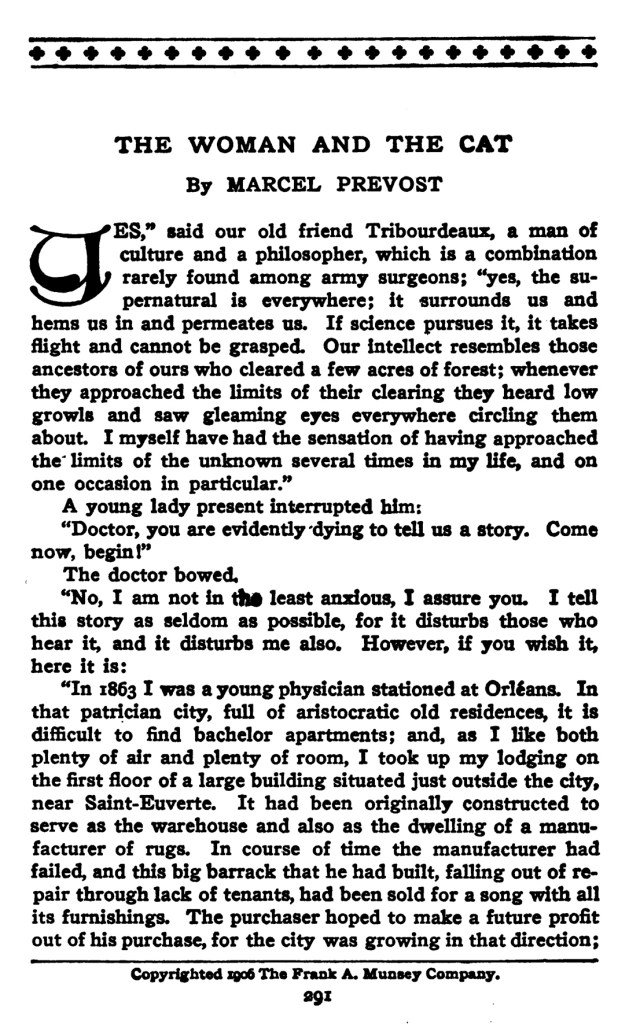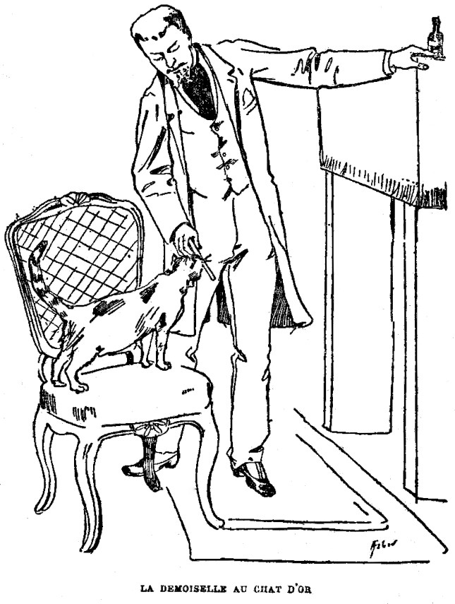 (Marcel Prévost, in Gil Blas, onzième année, n° 3649, jeudi 14 novembre 1889 ; repris dans La Lanterne, supplément littéraire, n° 430, 26 octobre 1890 ; dans « La Galerie de Gil Blas, » in Gil Blas, trente-sixième année, n° 18512 et 18513, mercredi 18 et jeudi 19 février 1914 ; dans Parisiana, n° 5, 27 juillet 1919. Cette nouvelle fantastique a été recueillie dans Notre Compagne (provinciales et parisiennes), Paris : Alphonse Lemerre, 1895, puis dans L’Accordeur aveugle, Paris : Alphonse Lemerre, 1905, illustrée par Francis Courboin. Elle a été traduite sous le titre « The Woman and the Cat, » dans International Short Stories, vol. III: French, edited by William Patten, New York: P. F. Collier & Son, 1910. Nous avons repris les illustrations de la collection « Modern Bibliothèque, » d’après les aquarelles de Charles Lapierre, Paris : Arthème Fayard [1913], et la gravure de La Lanterne)