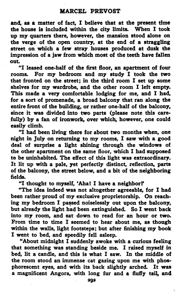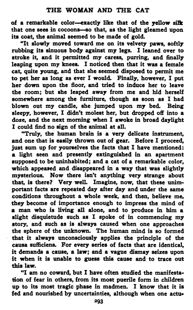 … Véritablement, le cerveau humain est un instrument facilement dérangeable. Associez en faisceau les faits que je viens de vous conter : une lumière vue, puis éteinte, dans un appartement inhabité ; un angora d’une couleur singulière qui apparaît et disparaît avec des allures un peu mystérieuses ; il n’y a rien là de fort émouvant, n’est-ce pas ? Bien… Imaginez maintenant que ces menus faits se répètent quotidiennement et dans des conditions identiques pendant une semaine : en voilà assez, croyez-moi, pour affecter le cerveau d’un homme qui vit seul, et lui donner ce petit frémissement, dont je parlais en commençant, que cause l’approche de l’inconnaissable.