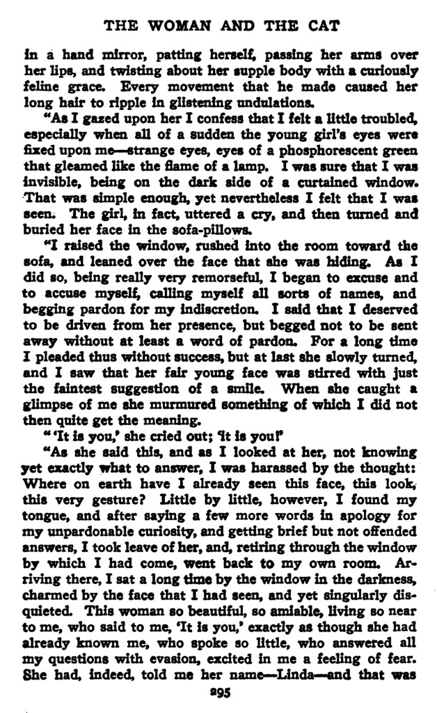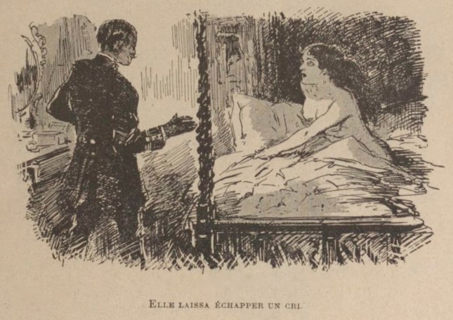 … Je regardais toujours, un peu troublé, je l’avoue, quand tout à coup les yeux de la jeune femme se fixèrent sur moi : des yeux étranges, des yeux de phosphore vert, qui éclairaient comme la lampe. J’étais sûr que j’étais invisible, étant du côté obscur d’une vitre drapée : c’est là une observation élémentaire. Pourtant, je me sentis vu… Elle laissa échapper un cri, puis se cacha le corps dans le couvre-pieds et la figure dans les oreillers.