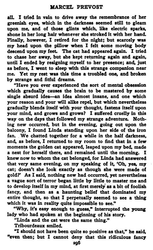 J’éprouvai cela cruellement, les jours qui suivirent mon étrange aventure. Aucun fait nouveau ne se produisait ; ce qui s’était passé la première fois recommençait, à cela près seulement que j’étais attendu chez ma voisine au lieu d’y entrer à l’improviste. Je quittais Linda au petit jour. À peine rentré chez moi, la chatte d’or apparaissait, sautait sur mon lit, s’y installait et y demeurait jusqu’au matin. Je savais maintenant à qui appartenait cette bête. Linda m’avait dit, une fois que j’en parlais : « Ah ! oui ! ma chatte… n’est-ce pas qu’elle a l’air d’être toute en or ? » Non ; rien de nouveau ne se passait, et pourtant une terreur obscure faisait peu à peu ma conquête, et le chancre de l’idée folle s’élargissait, d’abord un point minuscule, maintenant une tache, une lèpre de mon esprit, que je ne pouvais pas ne pas voir…