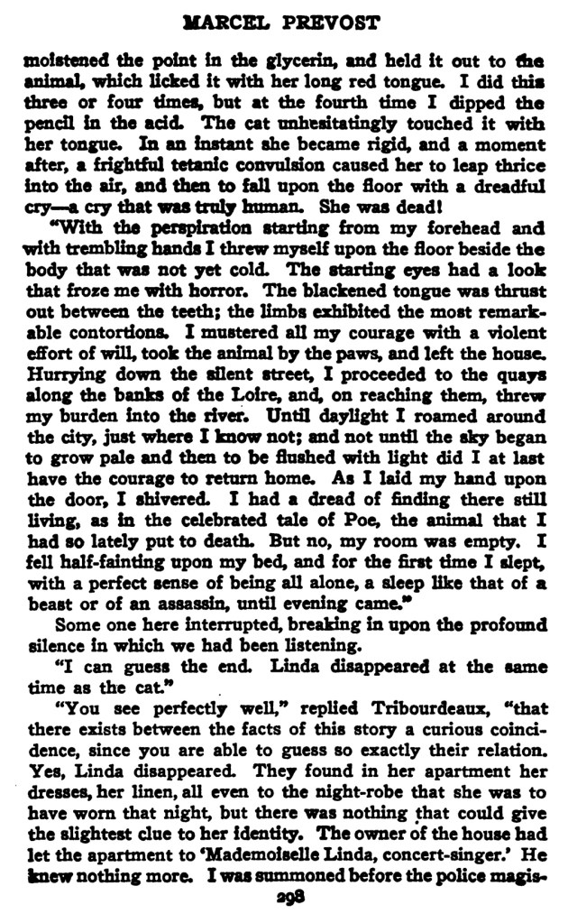 Jusqu’au jour, j’errai par la ville, je ne sais où. Quand le ciel pâlit, je me décidai à regagner ma maison. En posant la main sur le bouton de ma porte, je frissonnai : j’avais peur de retrouver vivante, comme dans le conte célèbre de Poe, la bête que je venais de tuer. Mais non, ma chambre était vide. Je tombai anéanti sur mon lit ; pour la première fois, je dormis, sûr d’être seul, je dormis d’un sommeil de brute et d’assassin, jusqu’au soir, jusqu’à six heures… »