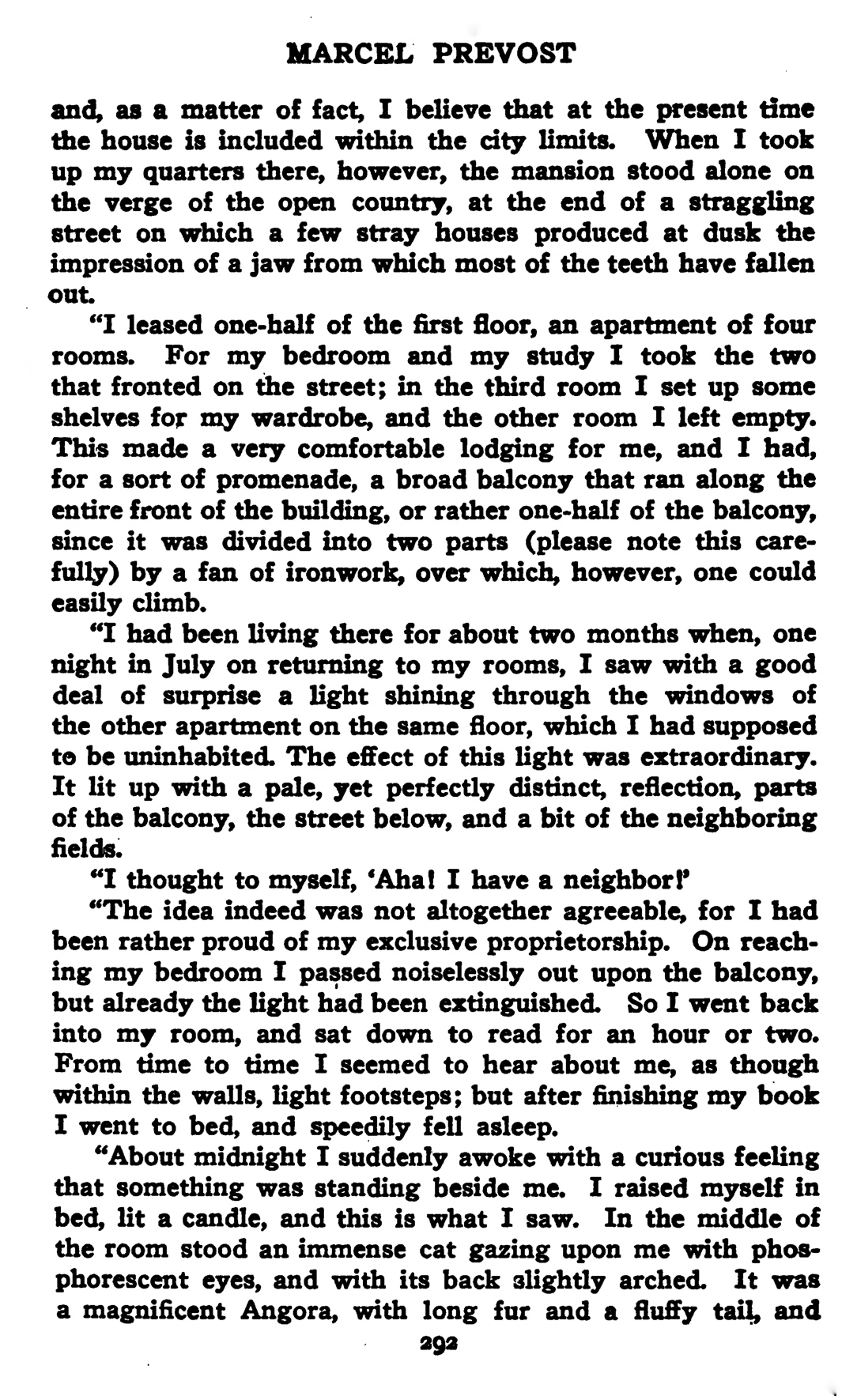 … Il y avait deux mois environ que j’habitais là, quand un soir de juillet, en entrant chez moi, je vis avec surprise une lumière briller derrière les vitres de l’appartement inhabité. L’effet de cette lumière était extraordinaire ; elle illuminait d’un reflet pâle et distinct un morceau de balcon, la rue et tout un secteur de la campagne.