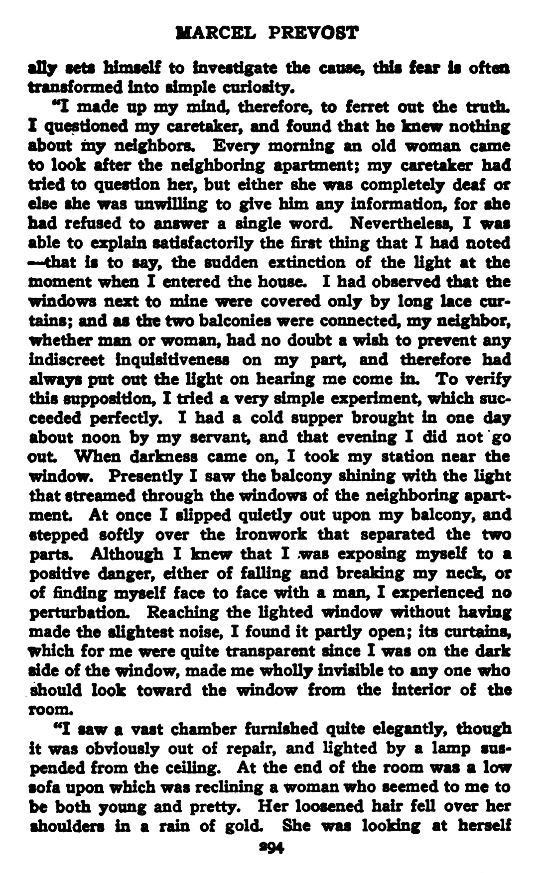 Néanmoins, je m’expliquais aisément le premier fait bizarre : l’extinction de la lumière quand je rentrais. J’avais remarqué que les fenêtres voisines des miennes étaient simplement masquées par de grands rideaux de dentelle ; d’ailleurs, les deux balcons communiquaient ; mon voisin ou ma voisine avait donc lieu de redouter les regards indiscrets, et éteignait sa lumière en m’entendant rentrer. Pour vérifier mon hypothèse, j’employai un moyen fort simple, qui réussit.