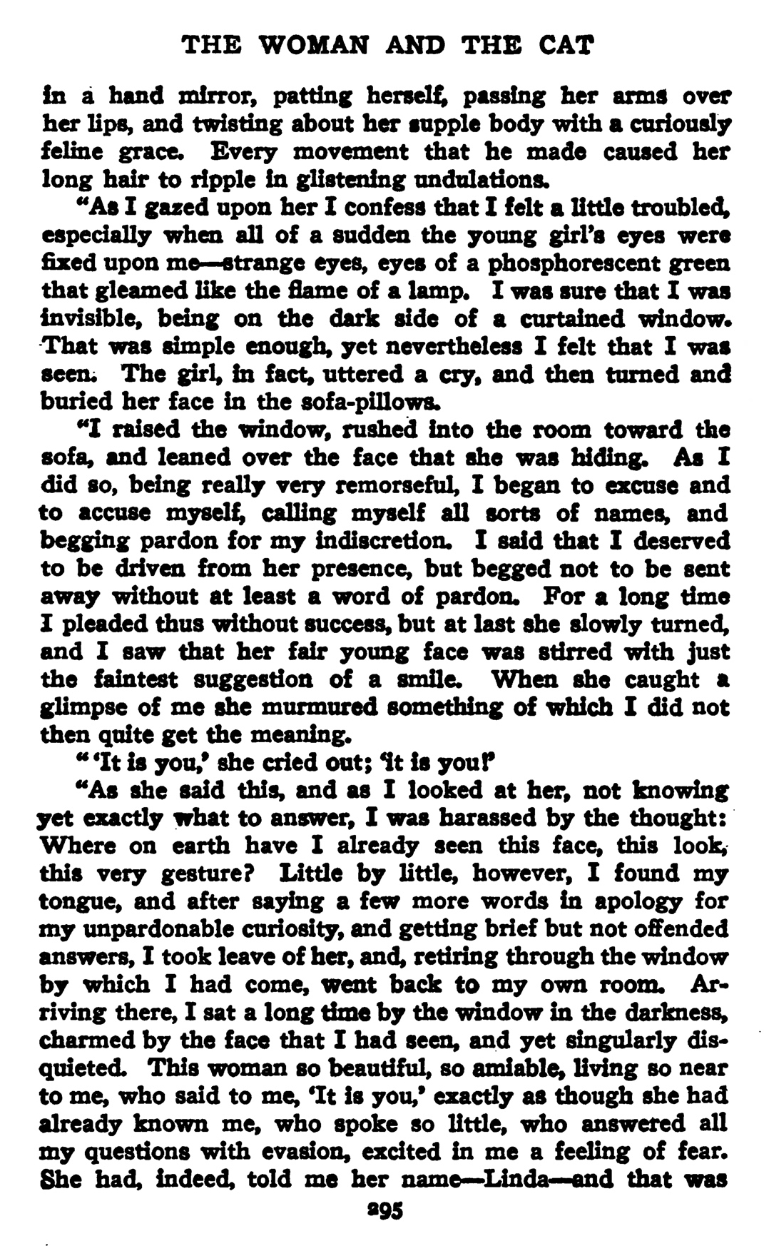 … Je regardais toujours, un peu troublé, je l’avoue, quand tout à coup les yeux de la jeune femme se fixèrent sur moi : des yeux étranges, des yeux de phosphore vert, qui éclairaient comme la lampe. J’étais sûr que j’étais invisible, étant du côté obscur d’une vitre drapée : c’est là une observation élémentaire. Pourtant, je me sentis vu… Elle laissa échapper un cri, puis se cacha le corps dans le couvre-pieds et la figure dans les oreillers.