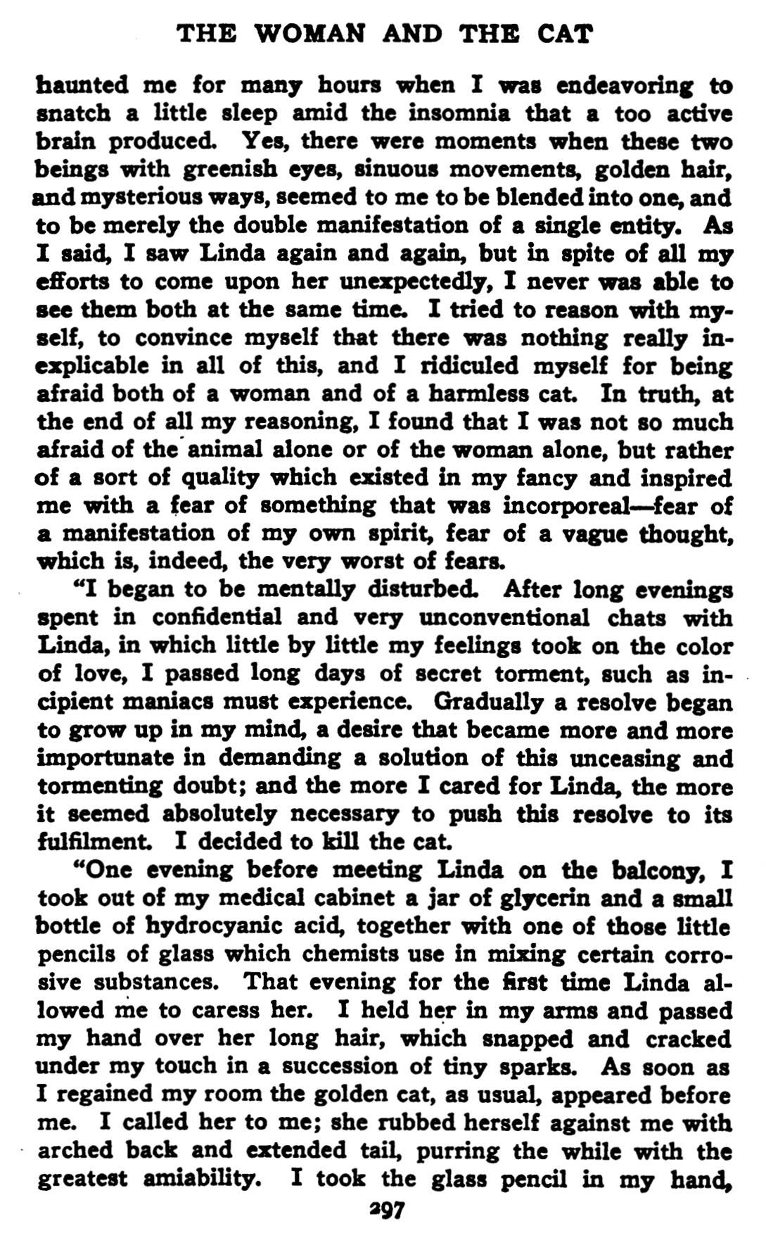 Un soir, avant de me rendre chez Linda par le balcon, je pris dans ma pharmacie un pot de glycérine, un flacon d’acide cyanhydrique et un de ces petits bâtons de verre que les chimistes appellent un agitateur. Nous eûmes cette nuit-là, Linda et moi, des caresses plus fougueuses que de coutume ; je la pressais dans mes bras, et toute sa chevelure dégageait sous mes doigts de vives étincelles…