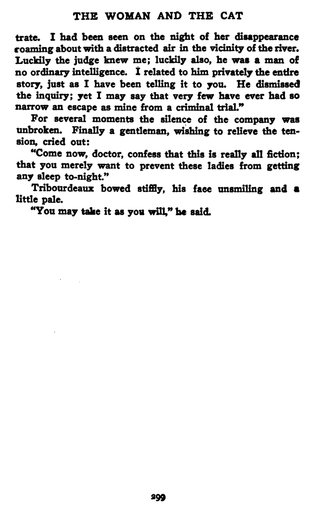 Jusqu’au jour, j’errai par la ville, je ne sais où. Quand le ciel pâlit, je me décidai à regagner ma maison. En posant la main sur le bouton de ma porte, je frissonnai : j’avais peur de retrouver vivante, comme dans le conte célèbre de Poe, la bête que je venais de tuer. Mais non, ma chambre était vide. Je tombai anéanti sur mon lit ; pour la première fois, je dormis, sûr d’être seul, je dormis d’un sommeil de brute et d’assassin, jusqu’au soir, jusqu’à six heures… »