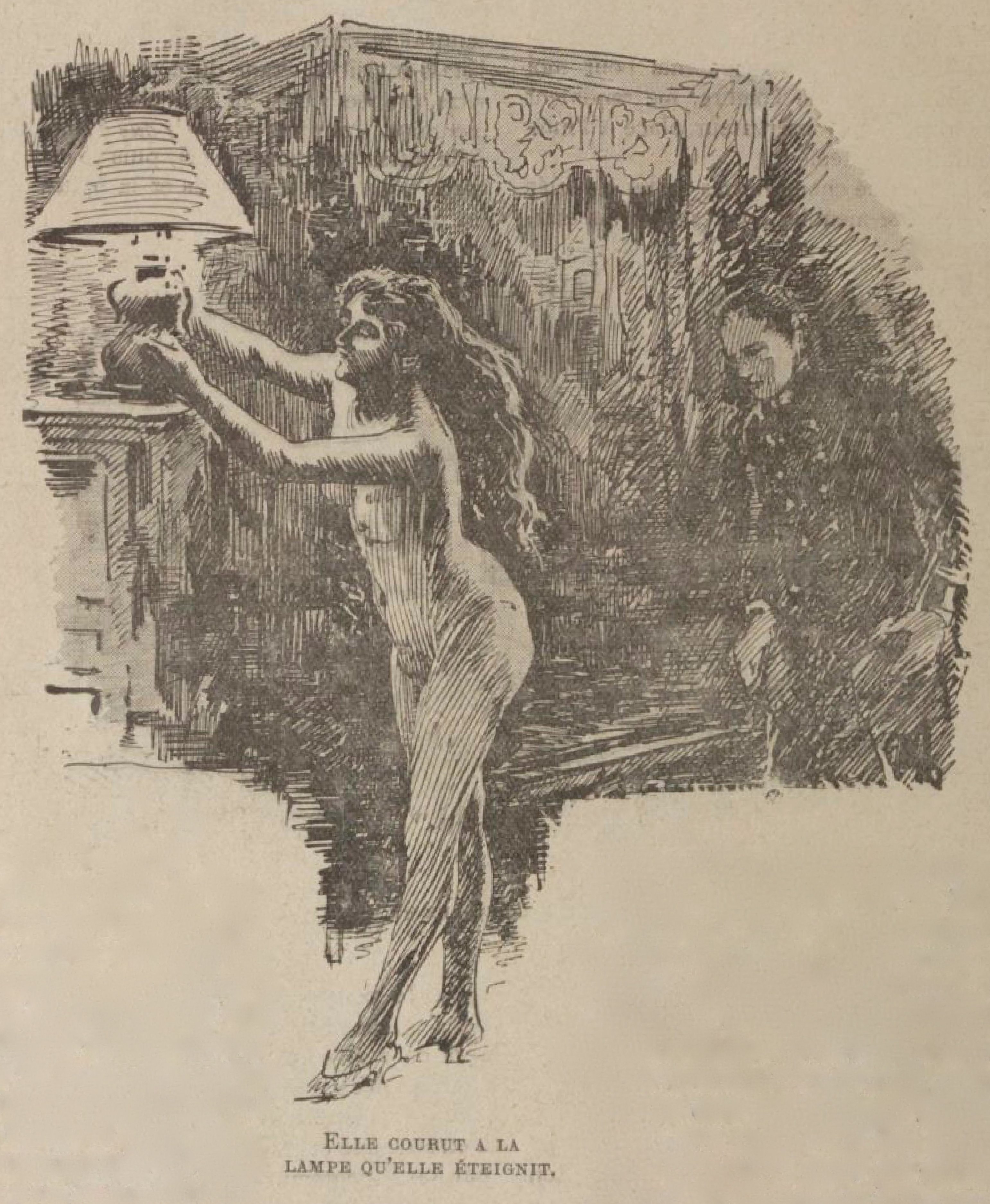 Je voulus prendre l’inconnue dans mes bras ; elle s’échappa avec une agilité de clownesse, courut à la lampe qu’elle éteignit. Puis elle revint, et ce fut elle qui, à son tour, me prit la tête dans ses bras et me couvrit de caresses… »