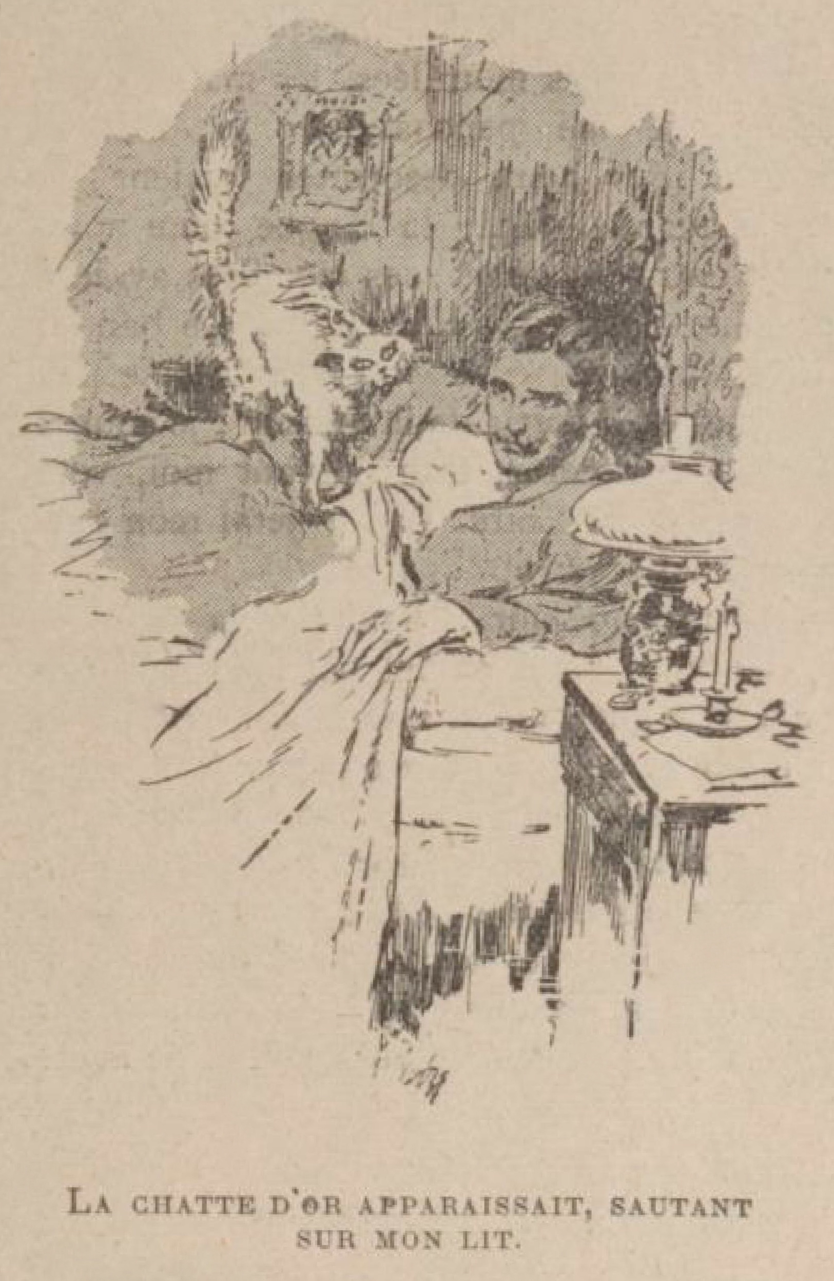 À peine étendu dans mon lit, je sentis un poids me tomber sur les jambes : c’était la chatte d’or.