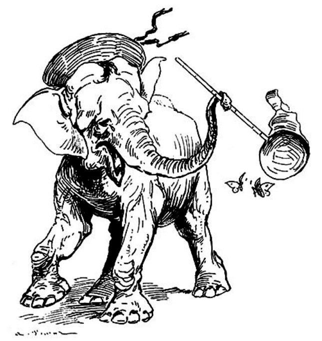 L’éléphant est un animal de mœurs paisibles et douces. – La preuve, c’est qu’on dit toujours « paisible et doux – comme un éléphant. » – Or, « l’éléphant » est précisément un animal de mœurs paisibles et douces.