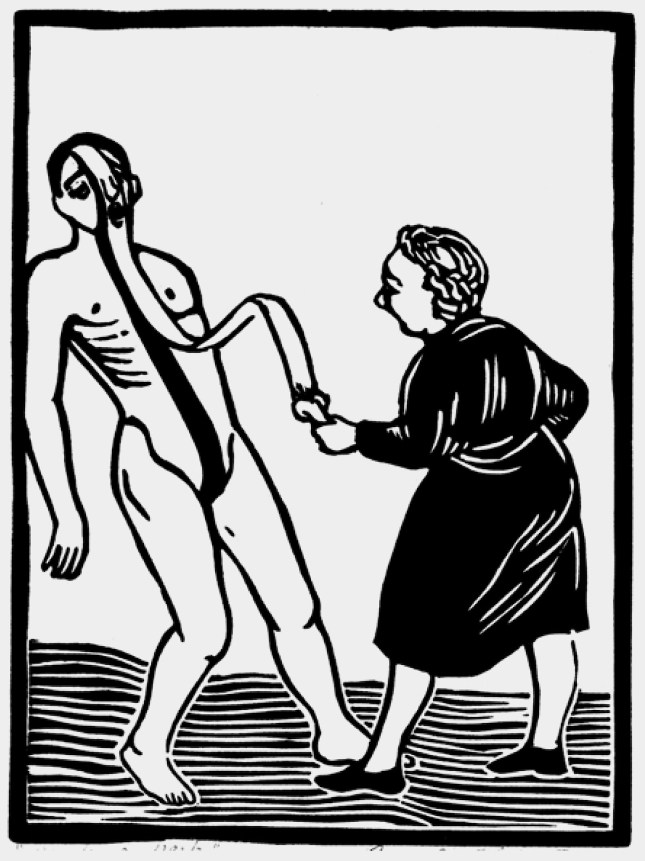 Soudain, je fus avec Georges dans une autre caverne. Nous débouchions à mi-hauteur de la paroi et en contrebas, sur la droite, au niveau du sol, je voyais s’ouvrir l’orifice très large d’une grotte dont le fond m’était caché par l’avancée de roche dans laquelle nous étions. Tout à coup, du fond de cette caverne, surgit une armée de formes grises, en haillons, dont on ne voyait ni visages ni mains ; et Georges m’expliqua : « Ce sont nos lépreuses. » Un femme parut dans le fond de notre grotte ; elle était en grand deuil et paraissait accablée de chagrin. Elle s’avançait résolument vers la caverne des maudites ; mais, à la vue de la horde répugnante, elle sembla saisie d’horreur et voulut fuir. Trop tard ! Les lépreuses se ruèrent en avant et l’entraînèrent. Elle se débattait ; toute la troupe était sur elle. Ces créatures ne semblaient pas vouloir lui faire du mal, mais seulement la toucher, comme pour être sûres de lui communiquer leur mal. Georges déclara : « Tu comprends, on ne peut les garder avec nous.» Au même moment, six infirmières parurent ; elles sortaient de l’antre aux lépreuses et, par un petit escalier creusé dans le calcaire, elles montaient vers nous, à la file. Georges ajouta : « Mais aussi, on ne peut pas les abandonner tout à fait… Alors, on accepte le risque, » conclut-il en me désignant les six infirmières qui passaient à nos côtés, pour rentrer se mêler au monde des cavernes. Elles m’inspirèrent un sentiment très vif du danger de contagion, mais pas pour moi : pour les autres habitants que je sentais groupés derrière nous, sans les voir, dans le fond du couloir par où je savais que nous étions venus… »