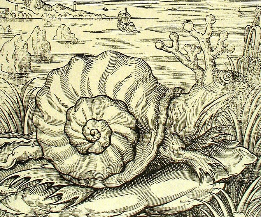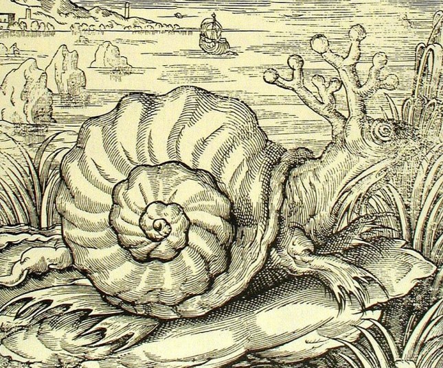 (Octave Béliard, « Les Contes du dimanche, » in L’Éclair, trente-troisième année, n° 11322, dimanche 29 février 1920 ; cette nouvelle a été reprise dans le recueil Le Décapité vivant et autres histoires d’outre-vie, Paris : Le Livre de Paris, [1944]. Gravure représentant le Limaçon de la mer Sarmatique, extraite des Œuvres d’Ambroise Paré divisées en vingt-huit livres, Paris : G. Buon, 1585)